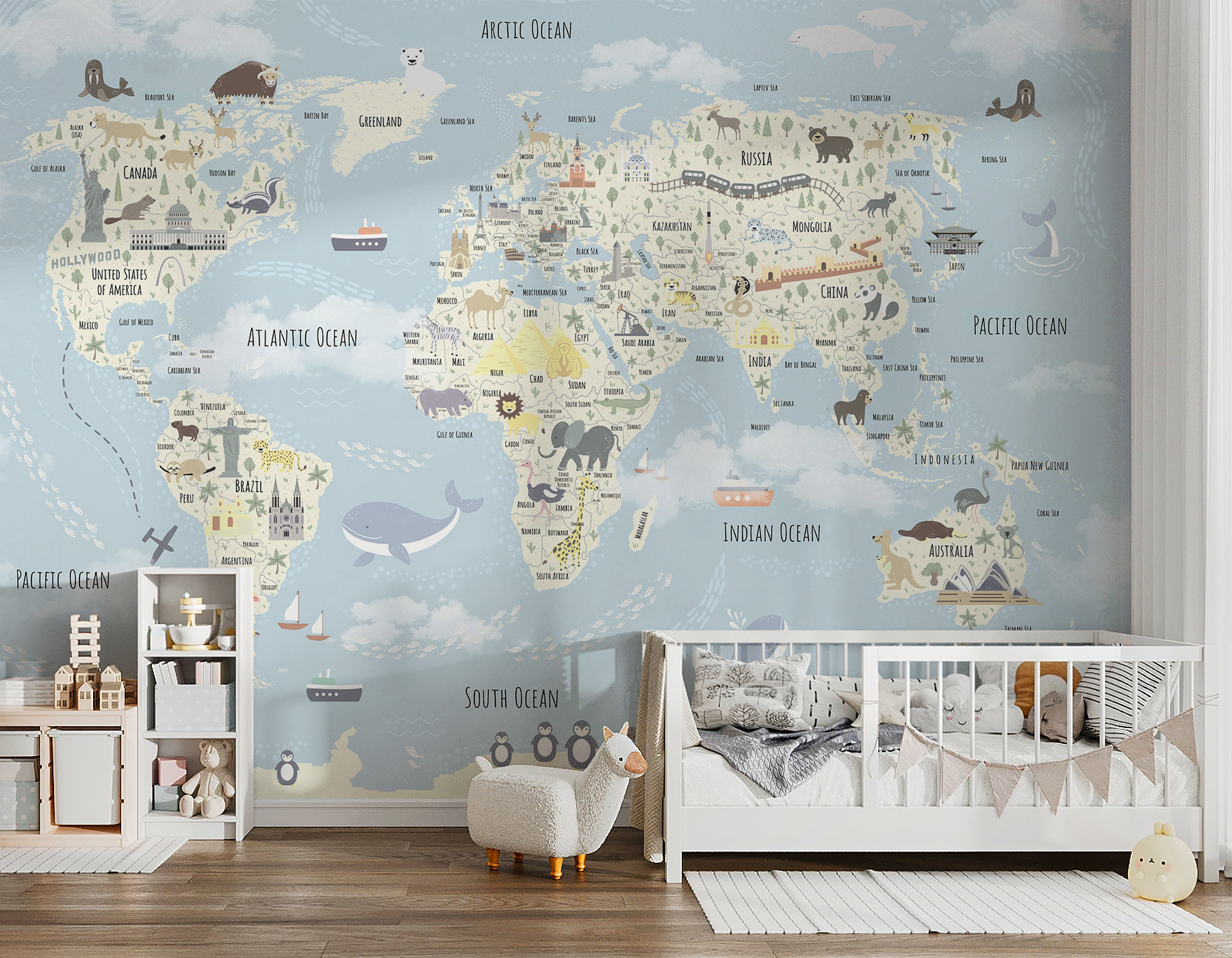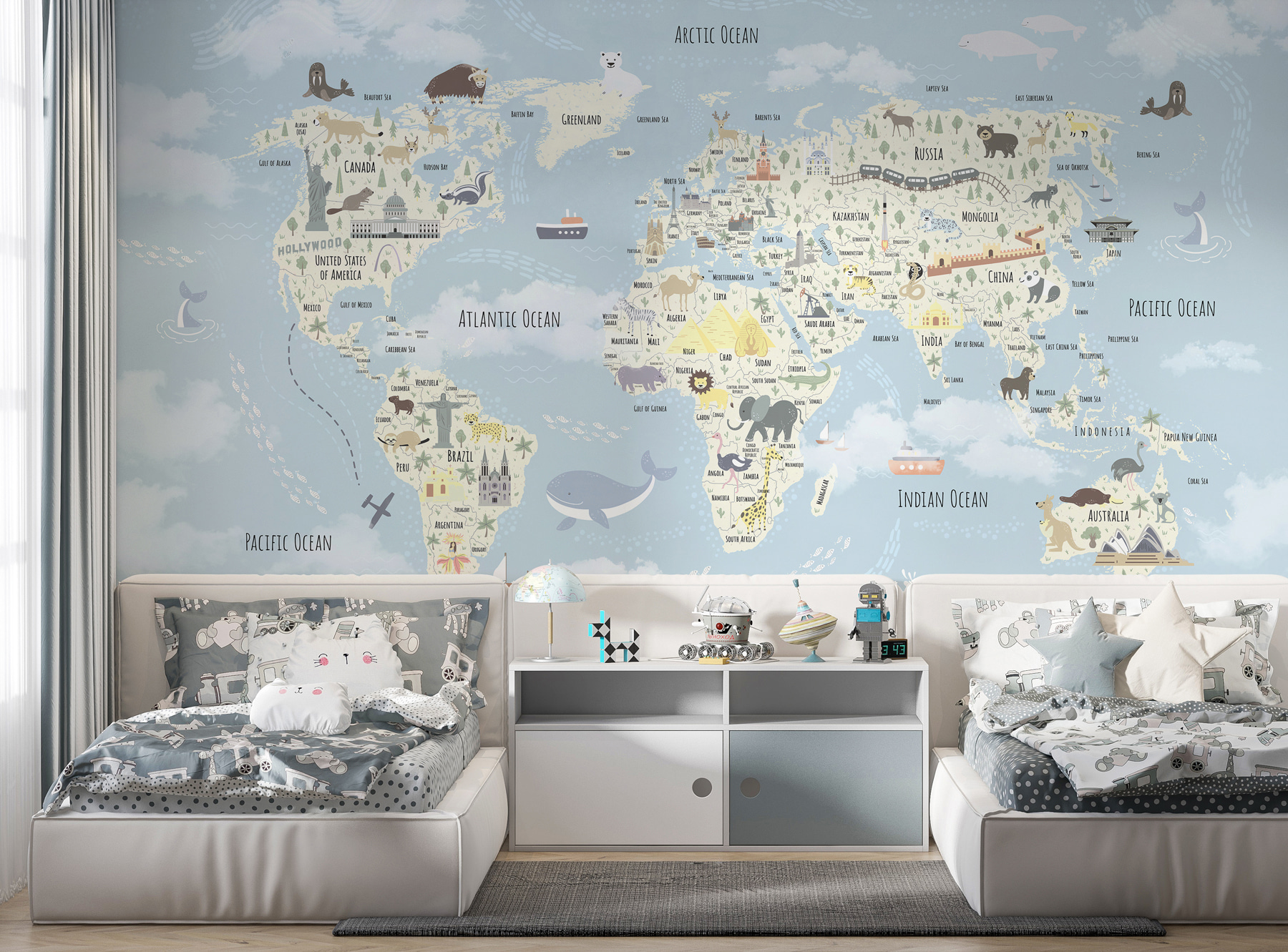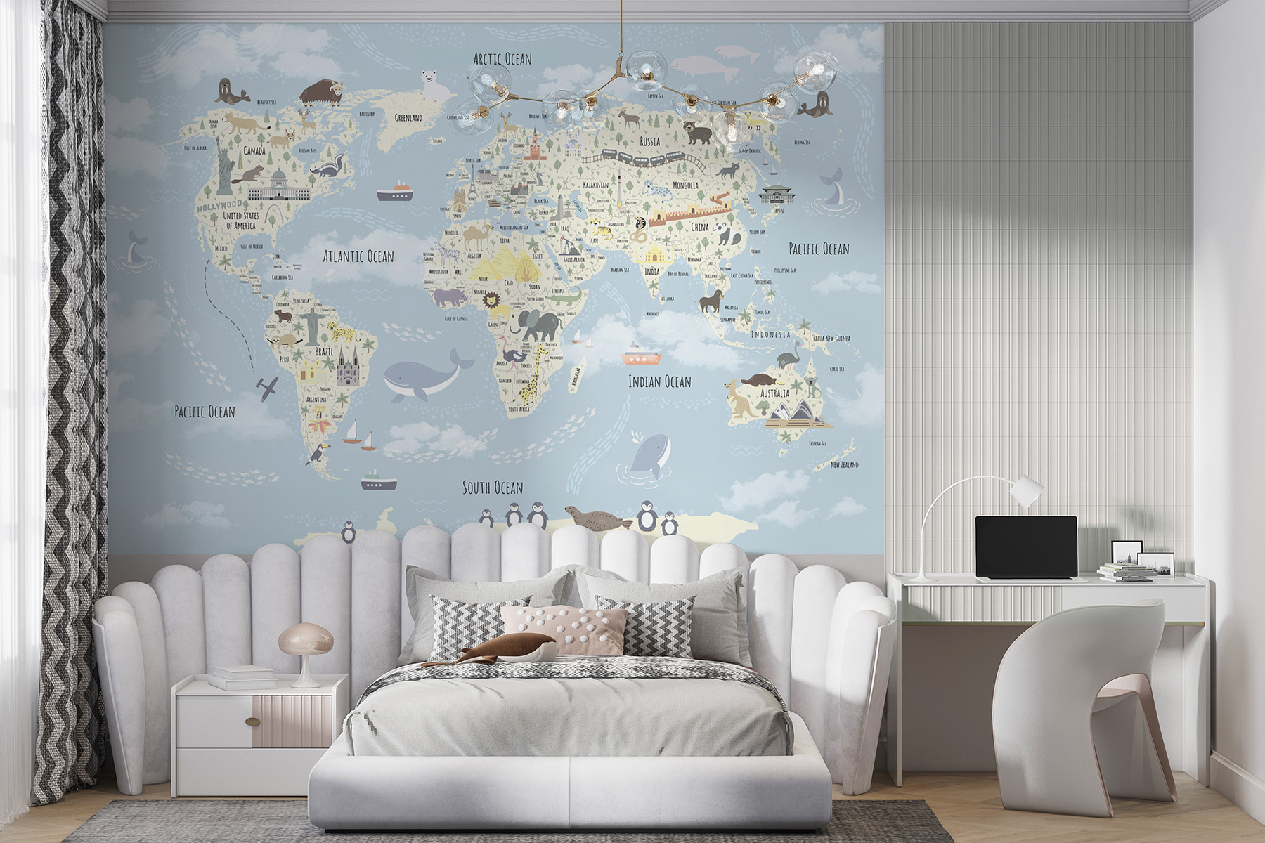 Immaginate questo murale con il mappamondo nella stanza di vostro figlio: è come se gli regalaste l’universo da esplorare senza uscire di casa. Ogni volta che lo guarderanno, saranno trasportati dall’Alaska all’Australia. Carino e dettagliato, è ricco di animali, punti di riferimento e curiosità. Le morbide tonalità pastello lo rendono delicato per gli occhi, aggiungendo un’atmosfera giocosa e rilassante. Perfetto per i più piccoli, che siano appassionati di geografia o semplici sognatori. Guardateli illuminarsi quando individuano un nuovo animale o un nuovo Paese, viaggiando per il mondo dal loro accogliente spazio! Ottimo anche per raccontare storie: immaginate le avventure che immagineranno. Inoltre, è così bello da essere un’opera d’arte a sé stante! Non è divertente?