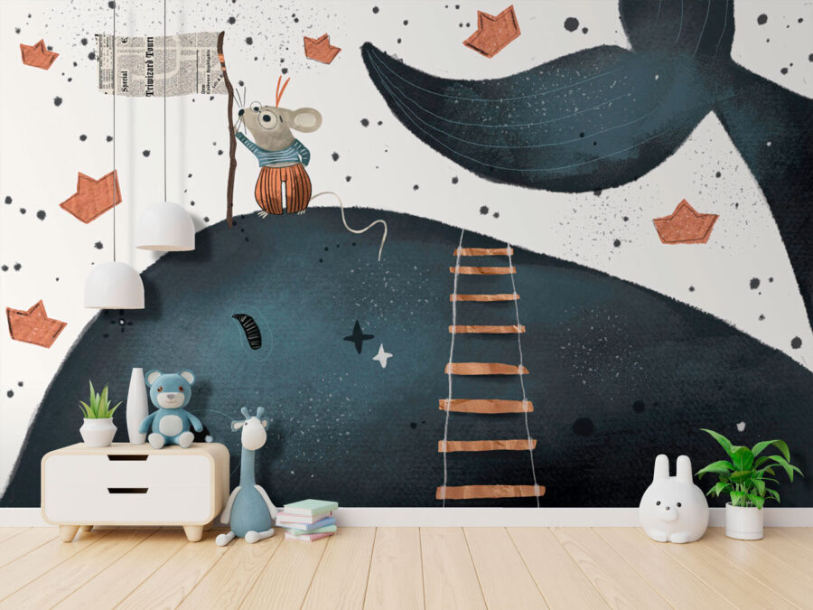 Trasformate lo spazio di un bambino in un’avventura stravagante con questo delizioso murale. Immaginatevi un allegro topolino che si arrampica coraggiosamente su una scala, sventolando una bandiera su una simpatica balena, circondata da incantevoli barchette di carta. È una storia visiva che aspetta solo di accendere la fantasia dei più piccoli.