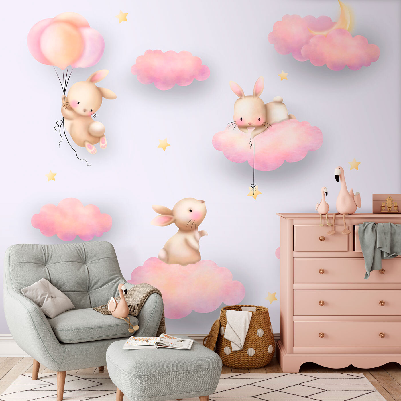 Immaginate che la cameretta del vostro bambino si trasformi in un bizzarro paesaggio da sogno con questo adorabile murale a forma di coniglietto! Questi dolci coniglietti fluttuano sulle nuvole, tengono in mano dei fili e raggiungono le stelle: sembra una scena di una favola della buonanotte! Perfetto per le stanze dei bambini, sia per vostro figlio o figlia, sia per aggiungere un tocco di magia a qualsiasi spazio per bambini.