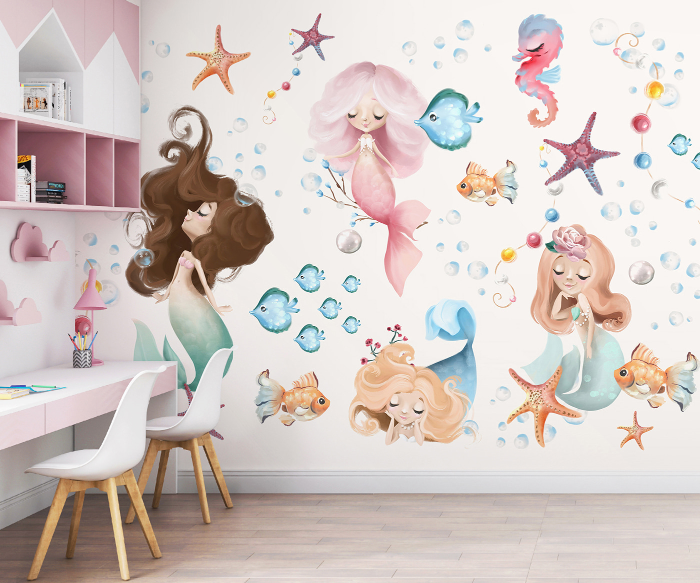 Immaginate questo: un delizioso murale dal fascino stravagante. Una bambina dei cartoni animati dai lunghi capelli castani galleggia pacificamente in un mondo sottomarino da sogno. Morbide tonalità pastello e giocosi amici marini (pesci allegri e graziose stelle marine) volteggiano in una danza magica. Che si tratti della cameretta del vostro bambino o di uno spazio che ha bisogno di un pizzico di allegria, questo murale trasforma le pareti semplici in un’incantevole scena da libro di fiabe. È come portare un po’ di paese dei balocchi direttamente a casa vostra: guardate come si illuminano i vostri occhietti! 🌊✨