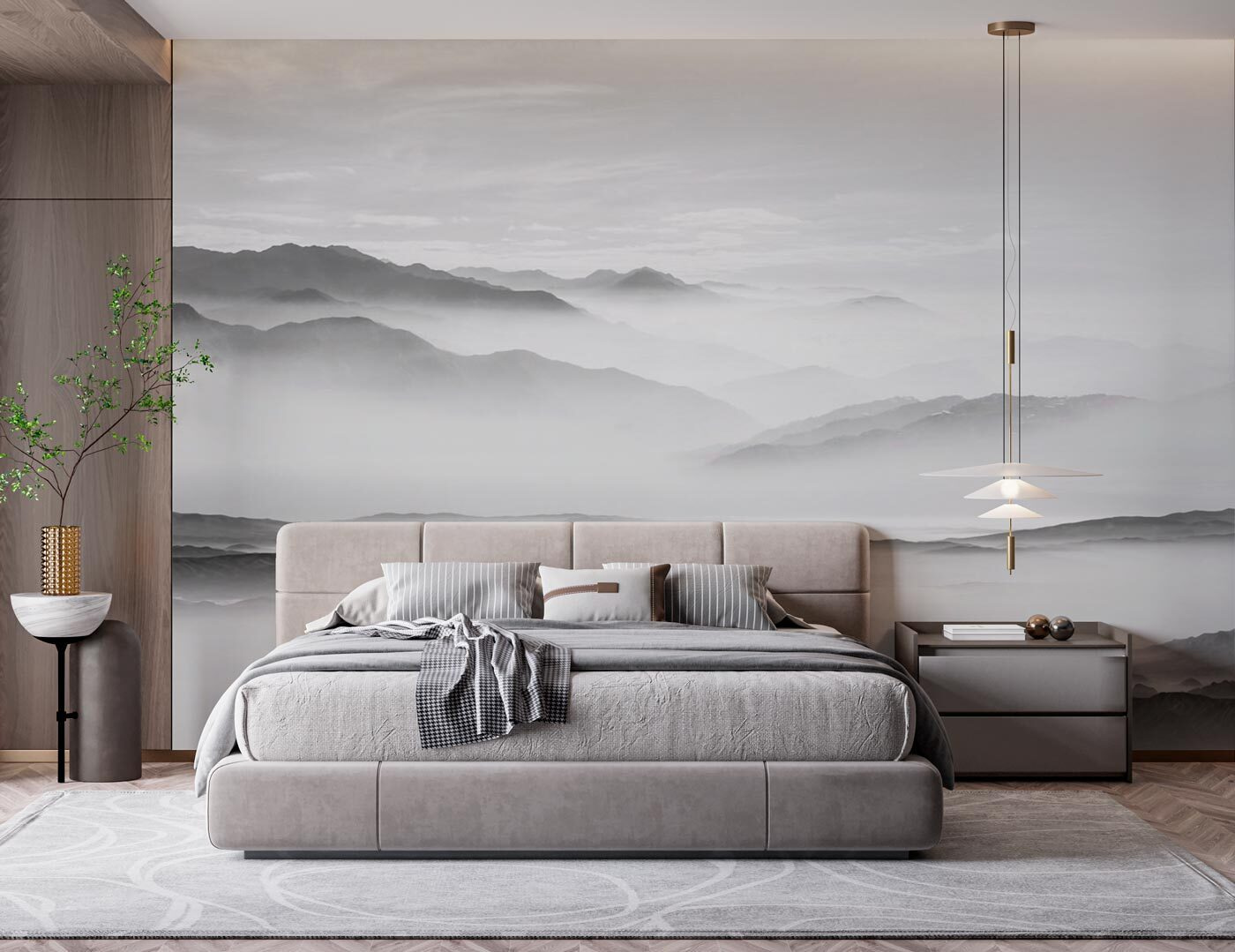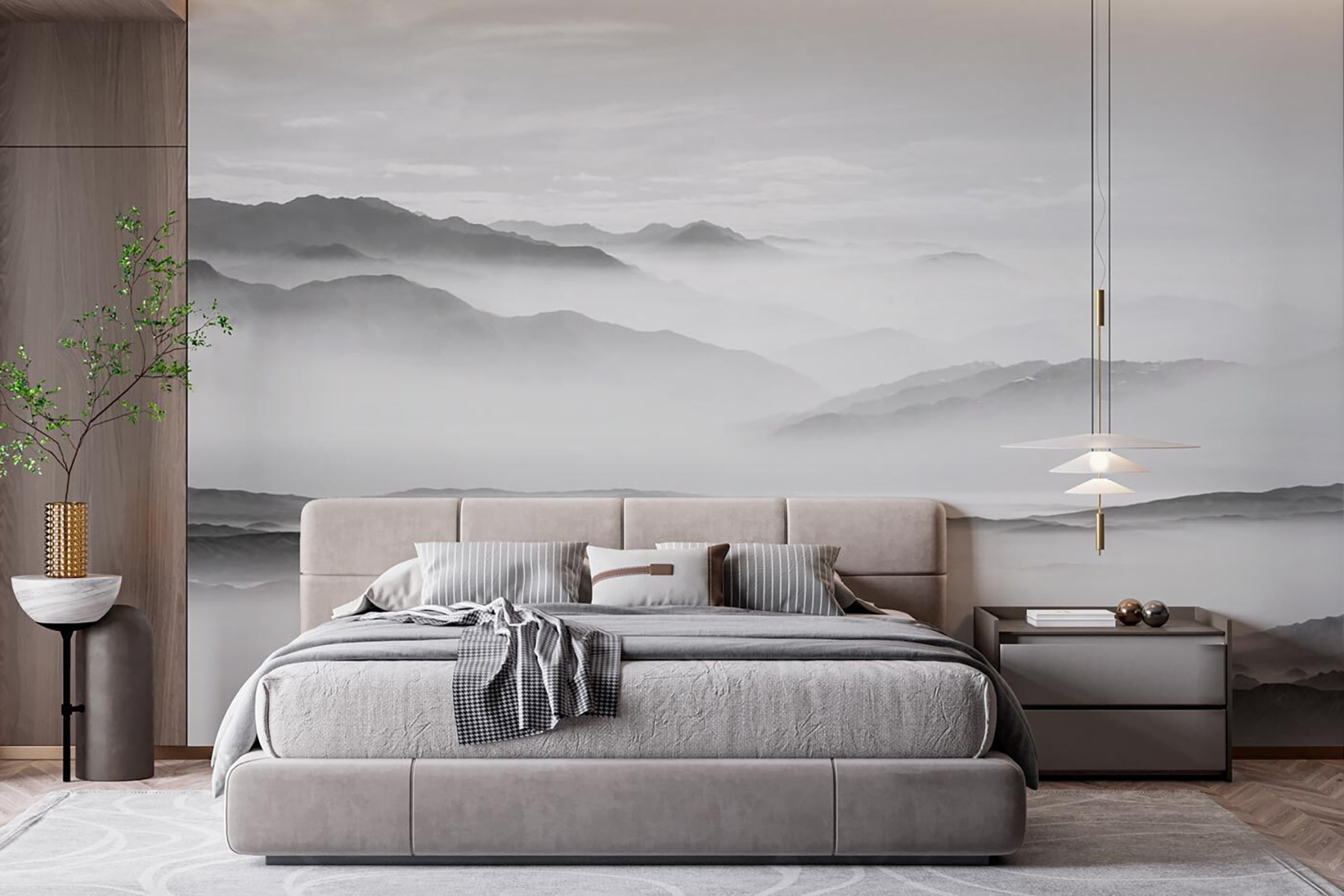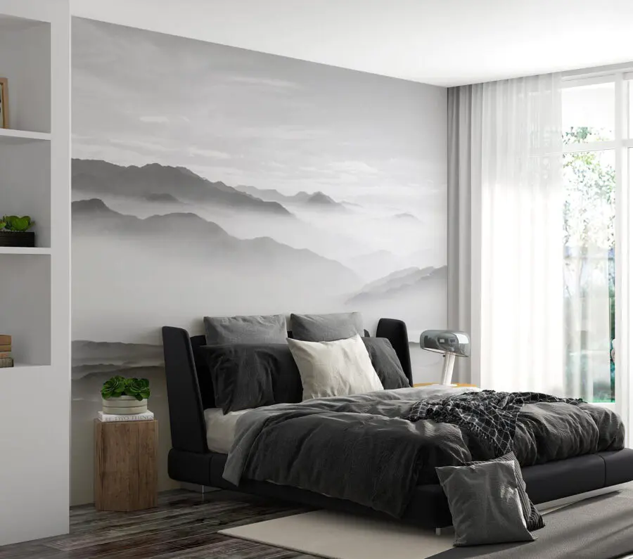 Le delicate tonalità di grigio creano un’atmosfera rilassante, che invita quasi a sorseggiare una tazza di tè caldo mentre si sogna fuori dalla finestra. Un momento prima si è nel pieno della frenesia della città e un momento dopo ci si perde in una tranquilla nebbia di montagna. È un ottimo spunto di conversazione e chi non vorrebbe condividere la propria parete con un po’ di magia della natura? Questo murale non si limita a decorare, ma crea uno spazio che sembra una boccata d’aria fresca.