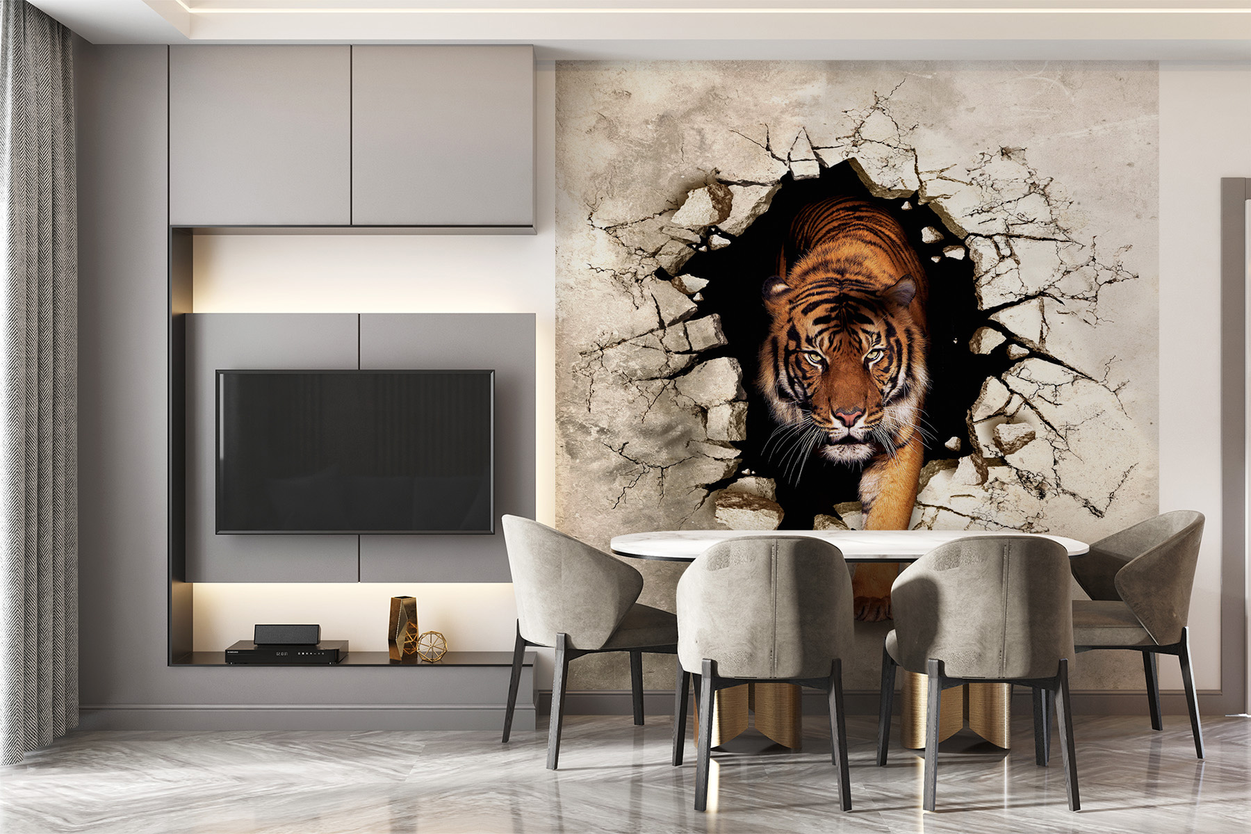 Avete mai pensato di avere una tigre feroce che attraversa il vostro muro? Questo splendido murale di una tigre che emerge da una parete crepata è perfetto se siete amanti dell’arredamento selvaggio! Immaginate: entrate in salotto ed ecco che una tigre si affaccia con uno sguardo intenso e accattivante. È come avere un pezzo di giungla proprio in casa, che irrompe dal cemento. È drammatico, è accattivante e, onestamente, è piuttosto eccitante. Chi non vuole un po’ di avventura nel proprio spazio? Inoltre, è un ottimo spunto di conversazione: i vostri ospiti non smetteranno di parlarne! Aggiungete un po’ di fragore all’arredamento della vostra stanza con questo ipnotico murale 3D. Fidatevi di me, amerete la dichiarazione audace che fa!