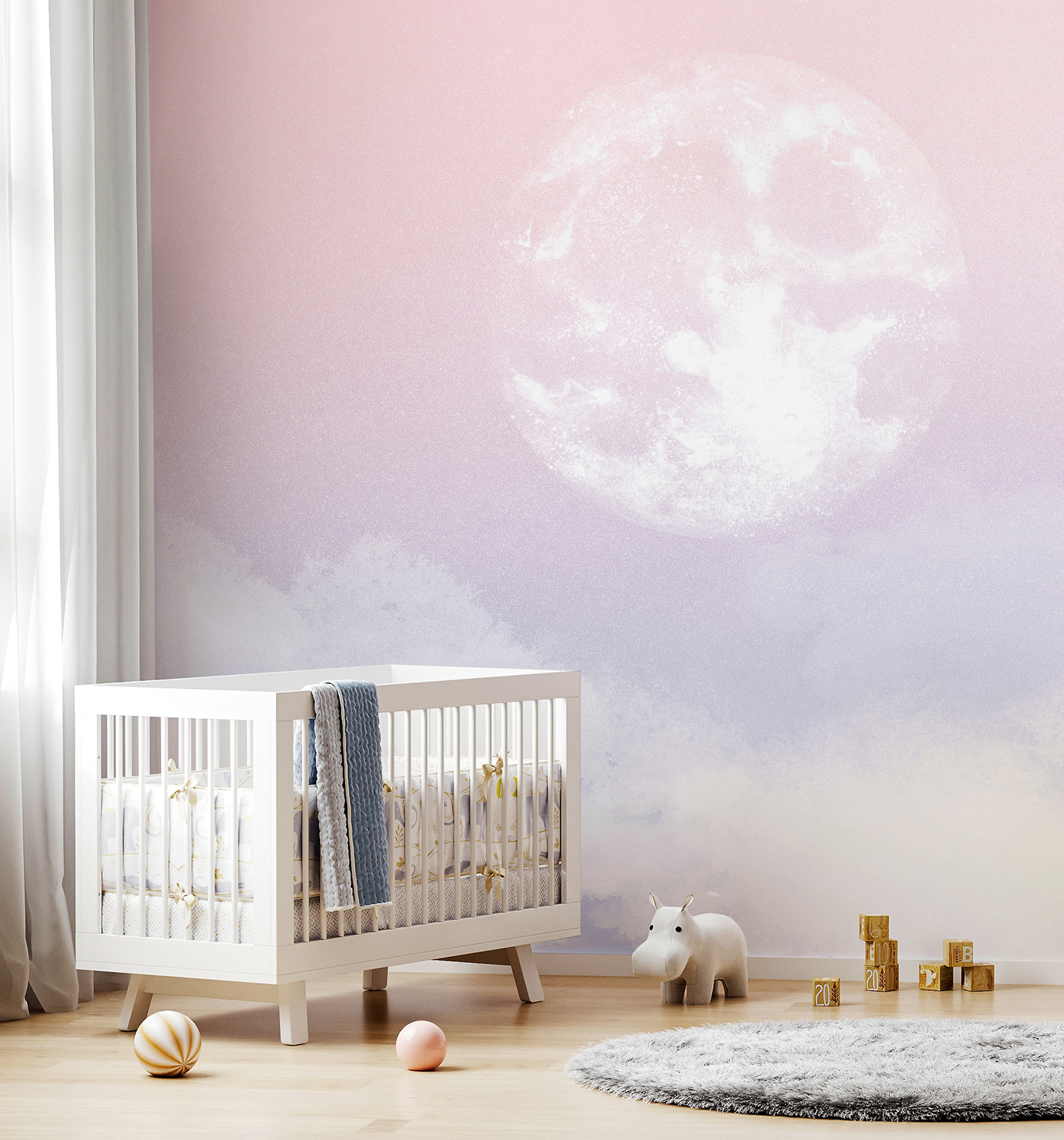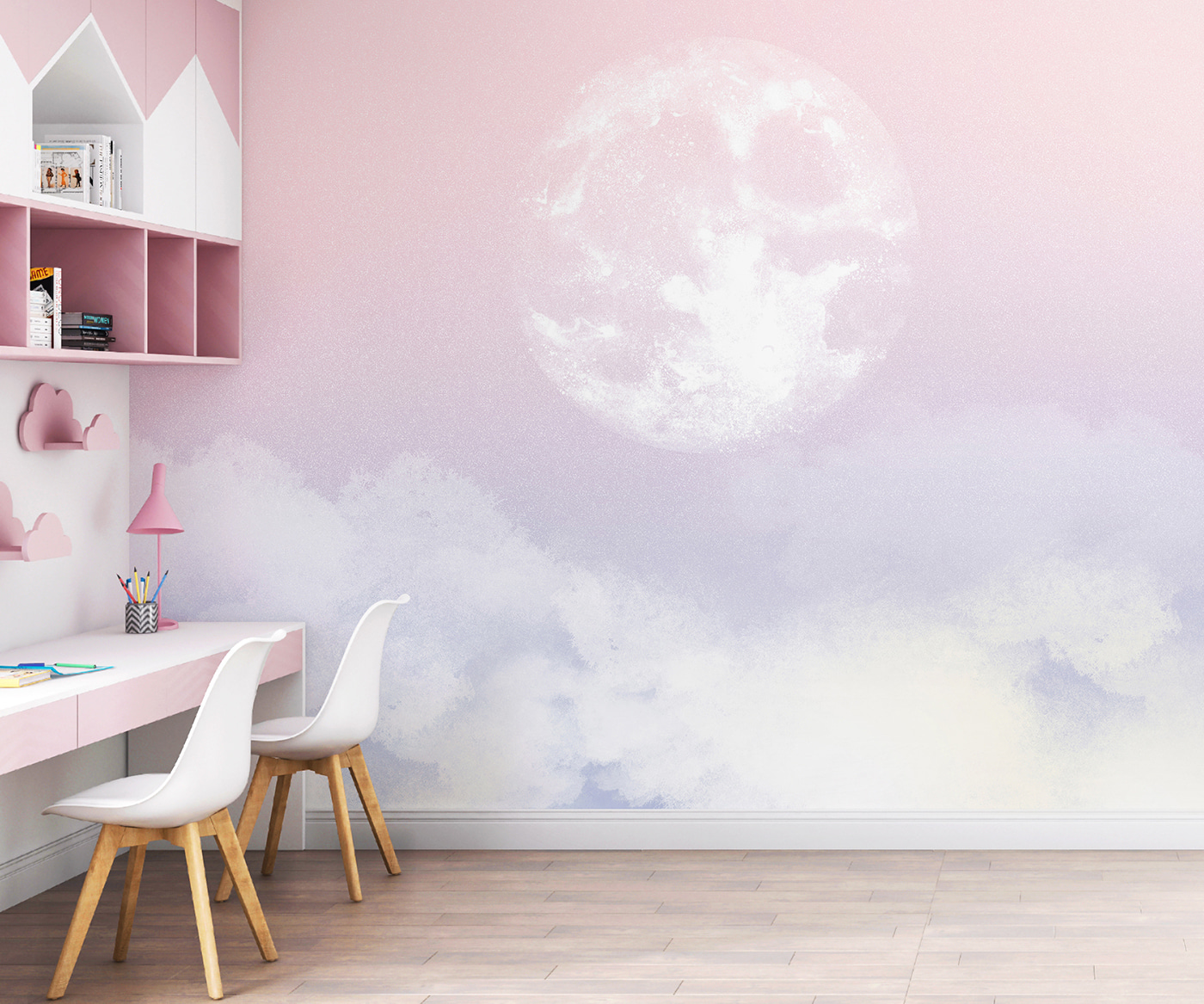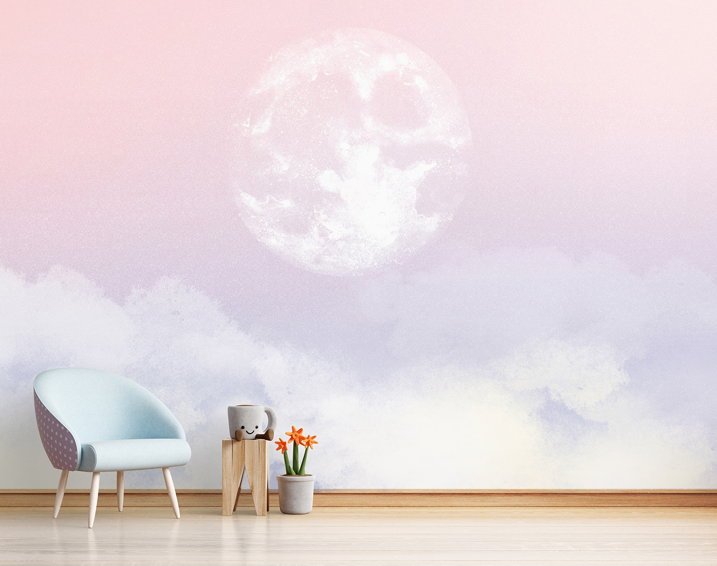 Questo sognante murale “Moon in the Sky” sembra uscito da una stravagante favola della buonanotte. Immaginate questa splendida luna che proietta una luce soffusa sulla stanza del vostro bambino, creando un’atmosfera serena e ultraterrena. Le tonalità pastello del rosa e dell’azzurro sono perfette per lo spazio di un bambino: delicate ma incantevoli.