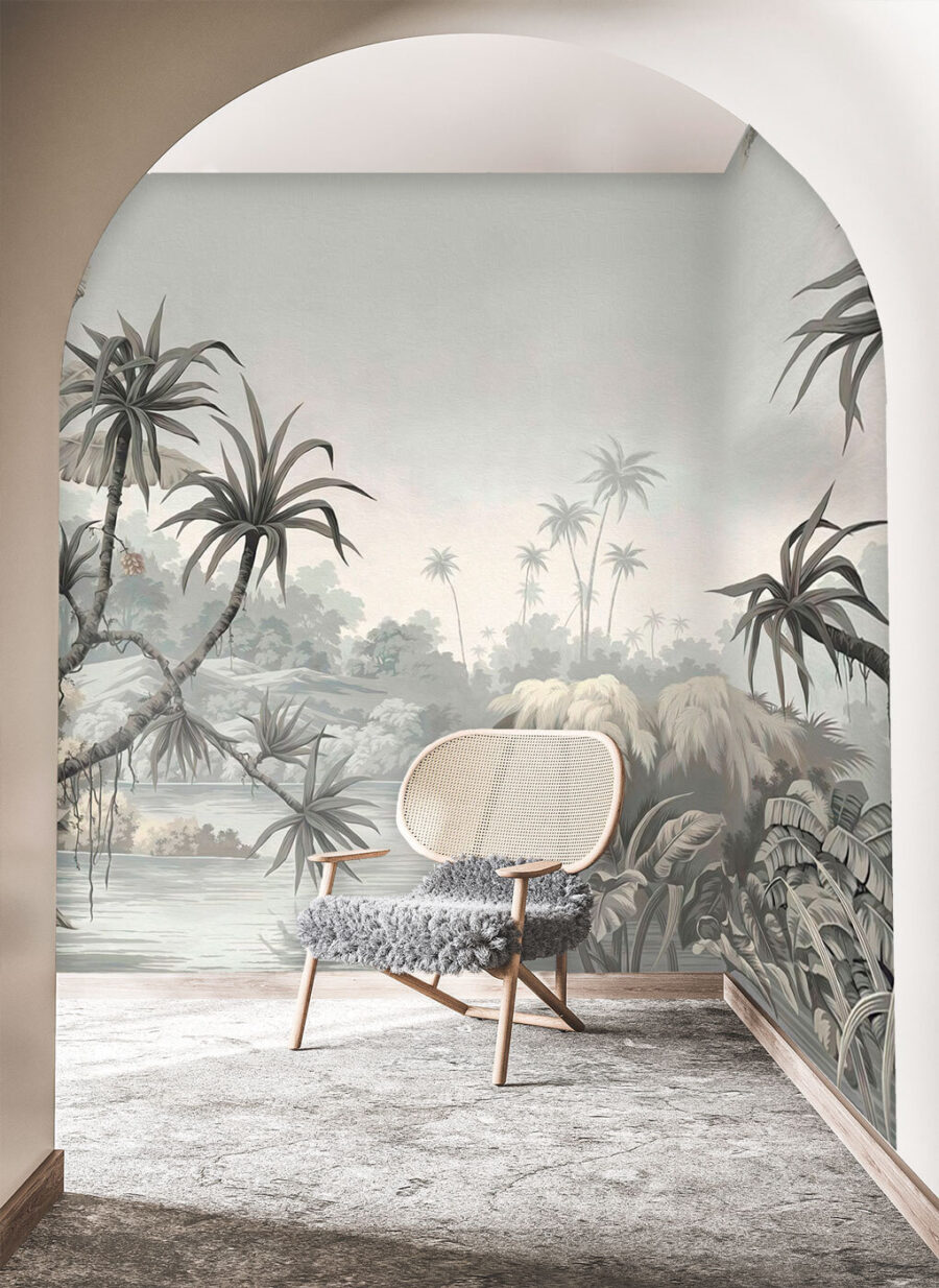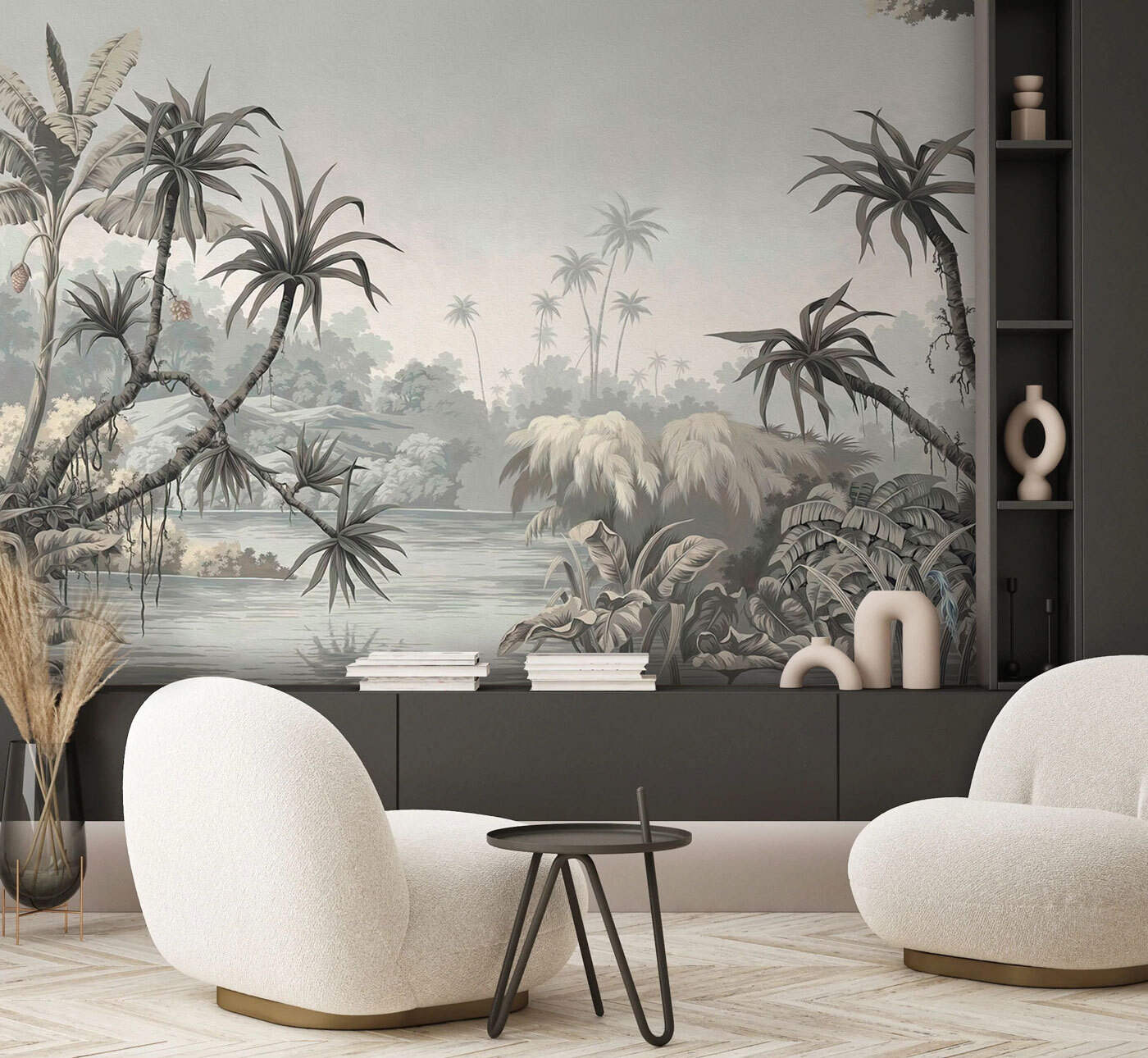 Immaginatevi di rilassarvi nel vostro salotto e, invece di fissare pareti vuote, di essere trasportati in questa serena oasi tropicale proprio a casa vostra. Questo murale “Tropical Landscape in Muted Tones” è come una boccata d’aria fresca con un tocco di mistero della giungla. Non è troppo forte, ma cattura comunque l’atmosfera verde e lussureggiante del fitto fogliame e degli alberi esotici.