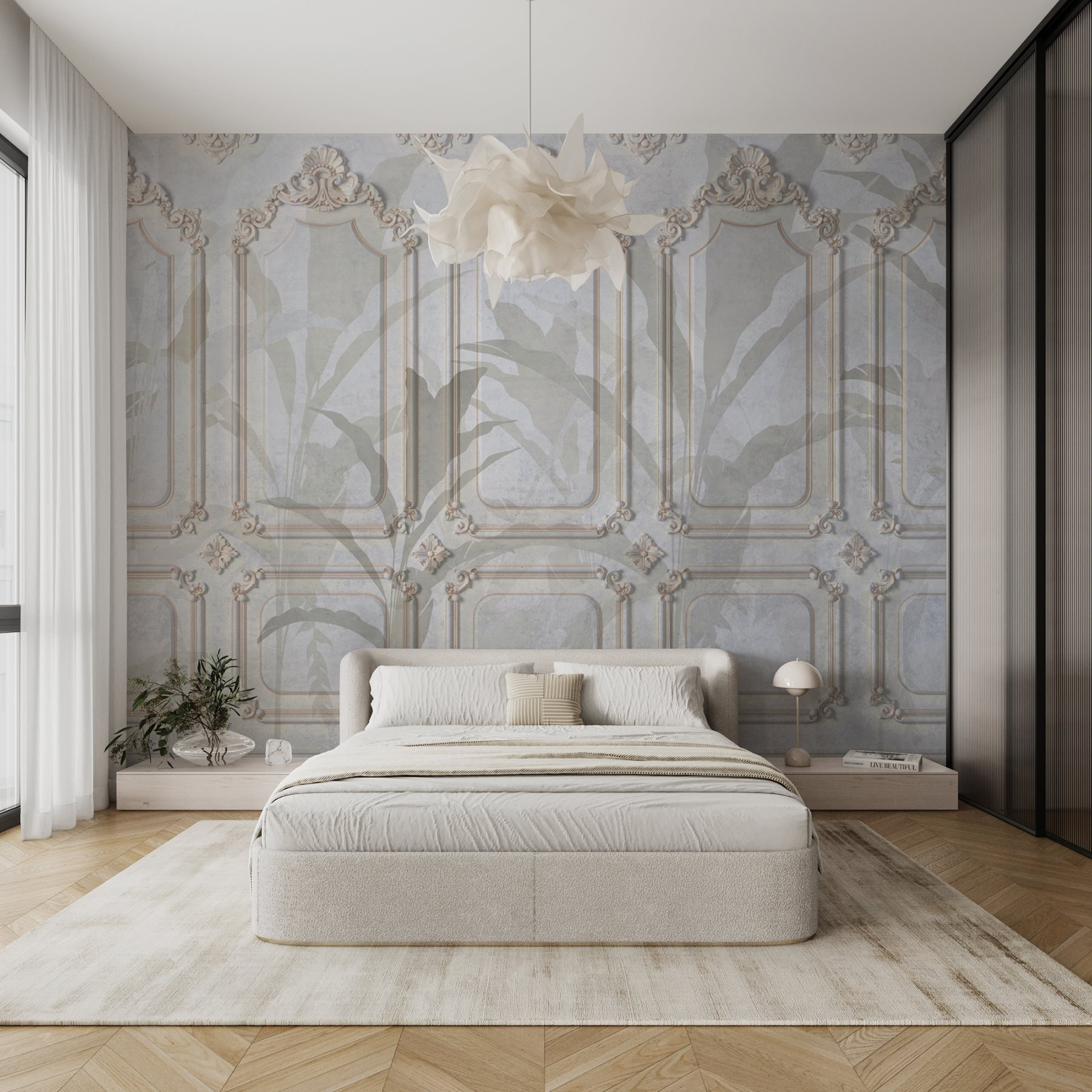 Guardate esattamente come apparirà il vostro spazio con la nuova carta da parati prima di acquistarla. Visualizzazione professionale da parte di designer esperti senza alcun costo o obbligo di acquisto.