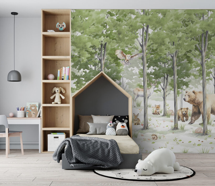 Immaginate di entrare ogni giorno nella vostra foresta incantata: ecco cosa vi offre questo murale “Gruppo di animali in una foresta”. È come se le vostre pareti si animassero di simpatiche creature, da volpi curiose a cervi maestosi, fino a un giocoso orsetto. Non si tratta solo di un murale, ma di una finestra su un altro mondo dove l’aria è più fresca e lo stress si scioglie.
