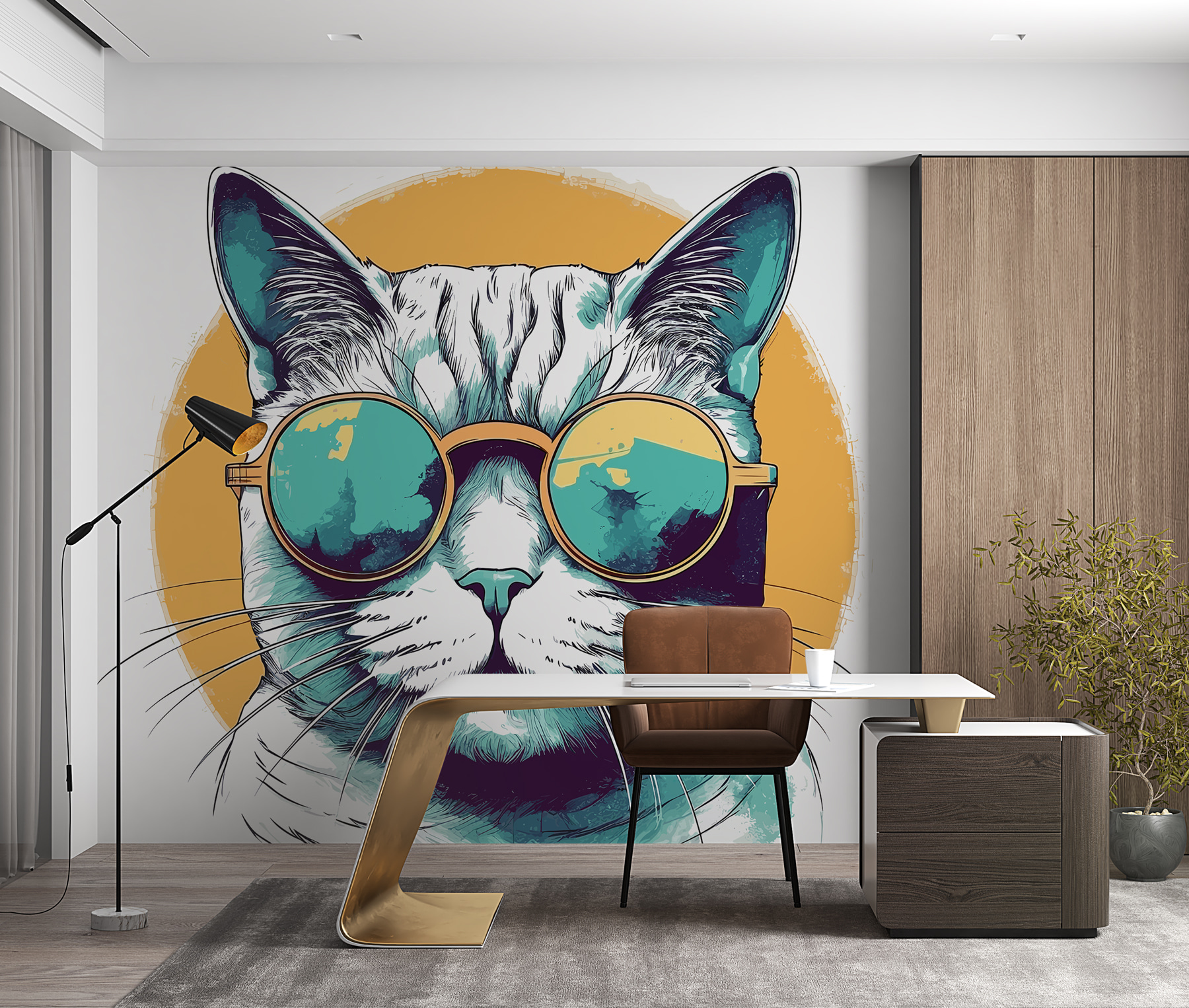 Preparatevi a conoscere il gatto più cool della città! Questo murale raffigura un elegante felino che indossa occhiali da sole un po’ troppo grandi, perfetti per dare un tocco di estrosità e personalità a qualsiasi ambiente. Immaginate di entrare nel vostro spazio e di essere accolti da questo affascinante gatto: è come avere un piccolo amico che vi ricorda di prendere la vita un po’ meno sul serio. Ideale per le camere dei bambini o per chiunque ami le decorazioni uniche, questo murale aggiunge un tocco di divertimento e colore. È il tipo di pezzo che accende le conversazioni e crea sorrisi: chi non vorrebbe questo tipo di atmosfera? Perfetto per dare un tocco giocoso a un salotto o per aggiungere allegria a una stanza dei giochi, potrebbe ispirare storie e risate davvero sciocche.