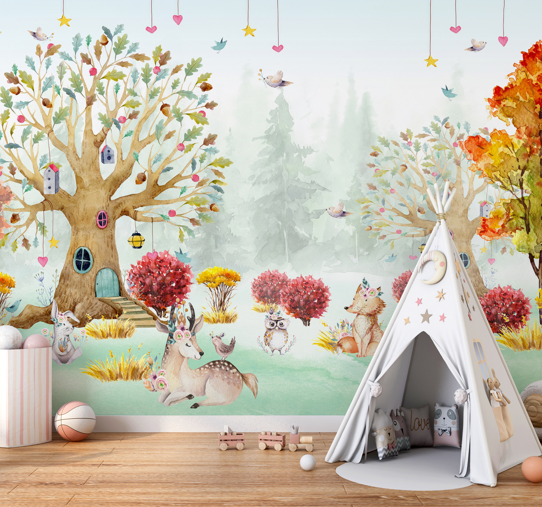 Trasformate la cameretta del vostro bambino in un sognante paese delle fiabe con questo murale “Acquerello di animali in una foresta”. Immaginate gli occhi del vostro piccolo che si illuminano quando scorgono i capricciosi cervi, le volpi e i gufi tra gli alberi, ognuno con i suoi dettagli simpatici e stravaganti. È come entrare in un libro di fiabe! Perfetto per le camerette e le stanze dei bambini, questo murale ha un fascino rilassante e pastello che renderà ancora più incantevoli le storie della buonanotte. Che si tratti di una foresta magica per vostra figlia o di un tranquillo bosco per il vostro bambino, questo murale crea la scena per far correre l’immaginazione e i sogni. I colori tenui dell’acquerello sono delicati e accoglienti e avvolgono lo spazio con calore. Questo murale non è solo una decorazione, è un’avventura che aspetta di svolgersi!