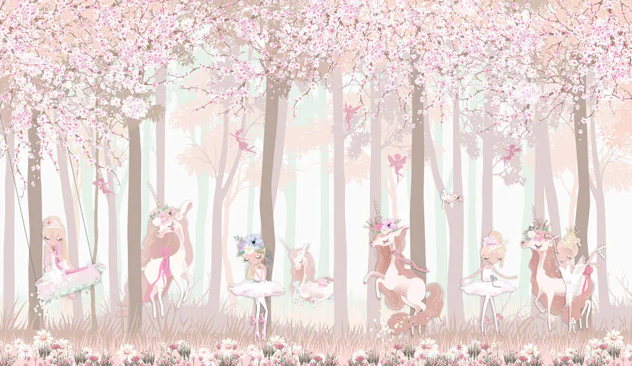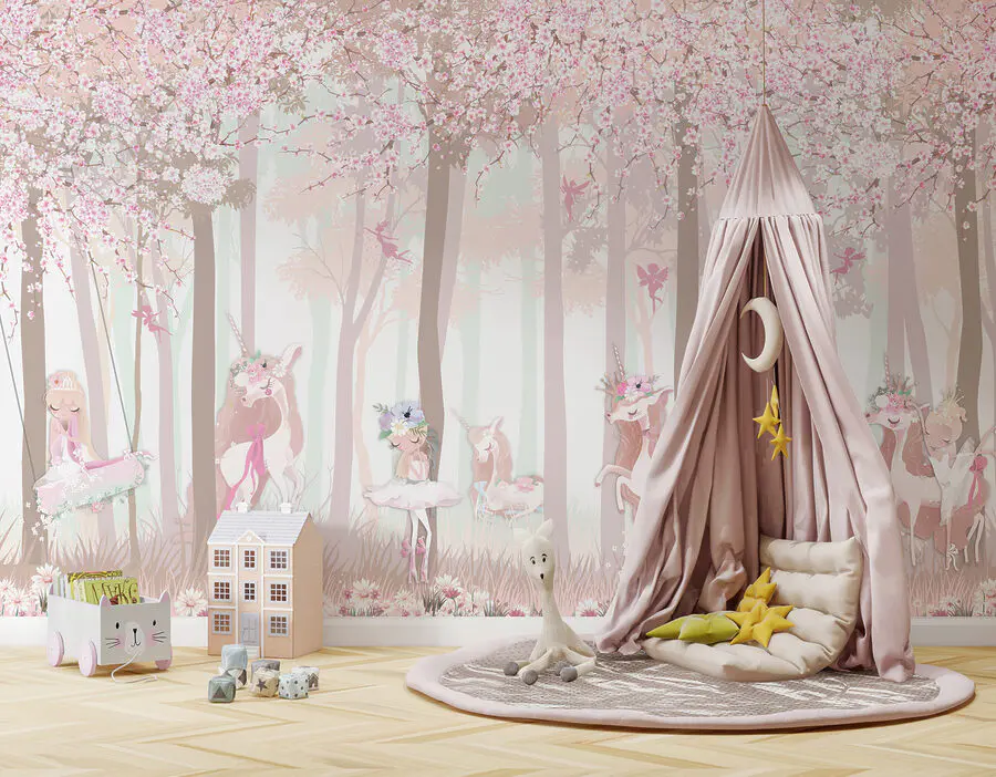 Immaginate di entrare in una favola ogni volta che entrate nella stanza! Questo splendido “Murales Cartoon of a Ballerina” è perfetto per creare una cameretta da sogno o per aggiungere un tocco di fantasia alla stanza di vostra figlia. Le delicate tonalità pastello e la magica scena della foresta, completa di eleganti ballerine e graziosi unicorni, fanno sembrare di passeggiare in un bosco incantato.
