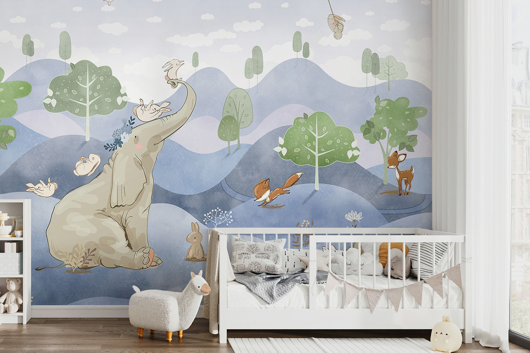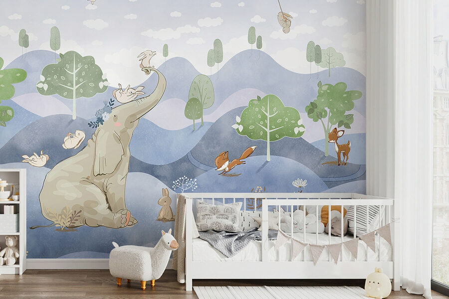 Immaginate di trasformare la stanza di un bambino in un bizzarro paese delle meraviglie con questo giocoso murale. Con un adorabile coniglio che tiene in mano un fiore, affiancato da un allegro cast di creature come un elefante, una volpe e un cervo, sembra uscito da un libro di fiabe. I colori pastello e il paesaggio da sogno trasmettono un senso di calma e gioia, perfetto per stimolare la fantasia dei più piccoli. Immaginate le storie della buonanotte che prendono vita o i pomeriggi pigri trascorsi a sognare ad occhi aperti. Lasciate che questo murale illumini qualsiasi spazio, creando un rifugio magico dove avventura e pace coesistono.