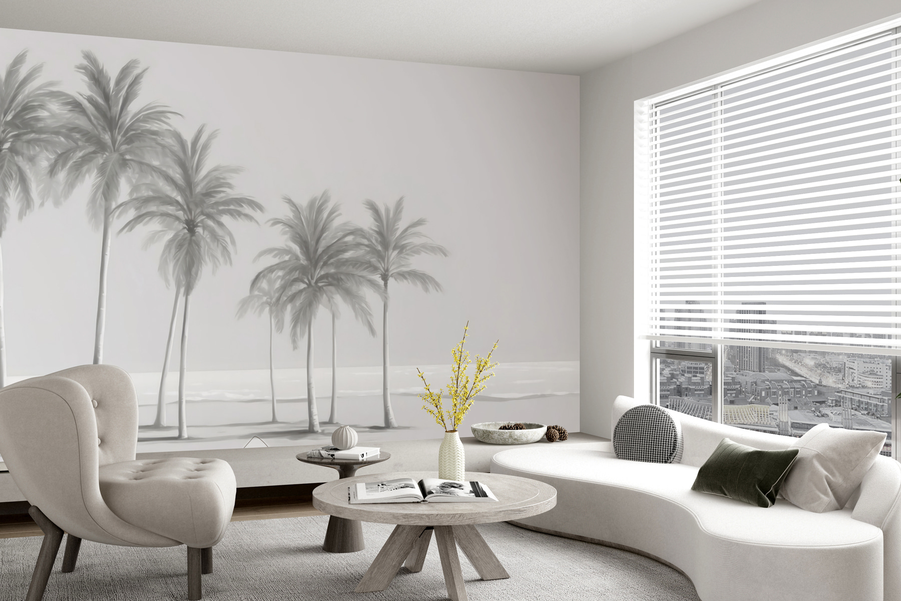 Questo murale presenta una scena con diverse palme alte ed eleganti che ondeggiano dolcemente come se fossero toccate da una brezza costiera. I colori tenui e sfumati lo rendono quasi onirico, un po’ come una foto d’epoca che immortala una tranquilla giornata in riva al mare. Si adatta a qualsiasi arredamento, moderno, boho o altro. Inoltre, è super confortante; il tipo di vista che ti fa immediatamente espirare.