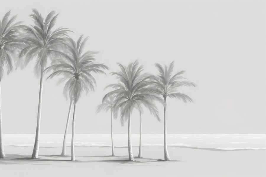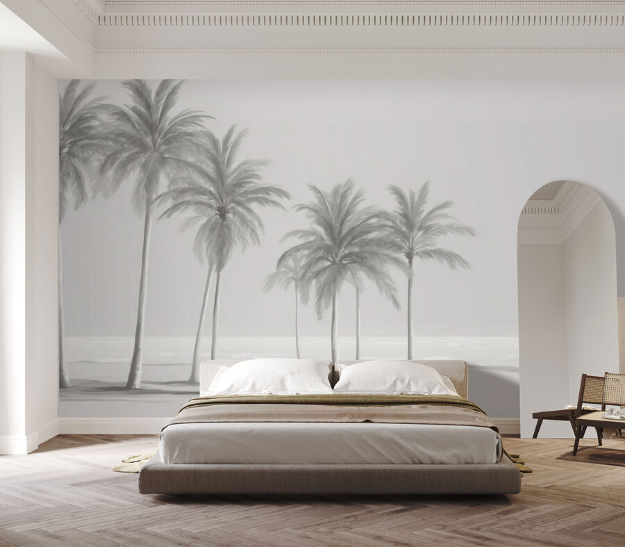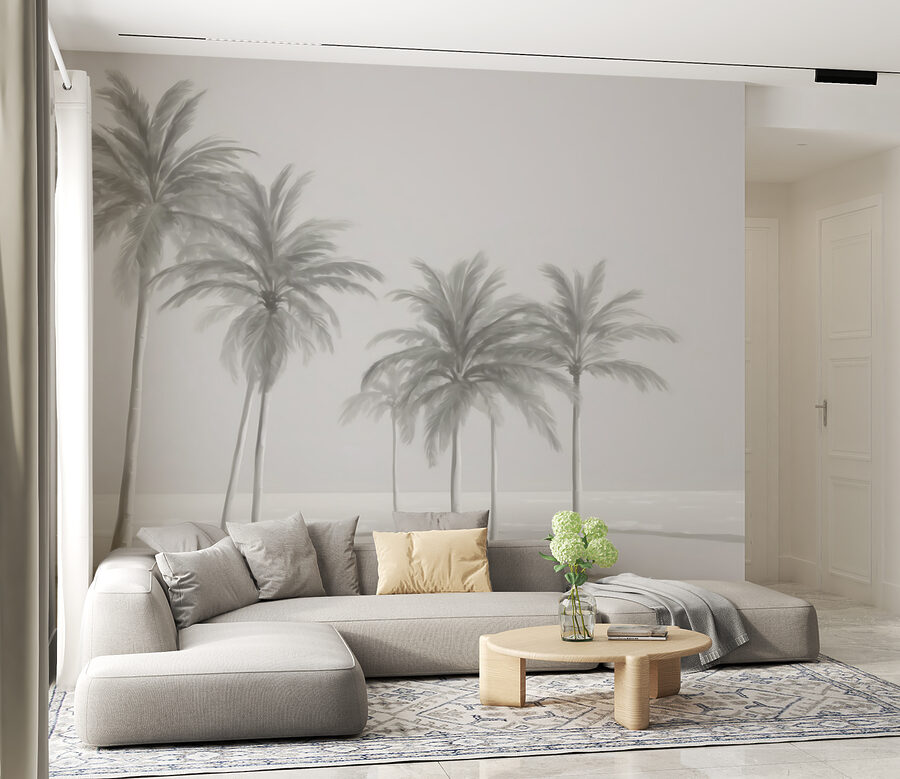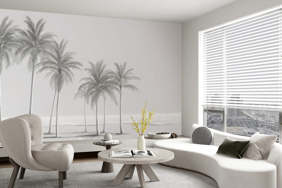 Questo murale presenta una scena con diverse palme alte ed eleganti che ondeggiano dolcemente come se fossero toccate da una brezza costiera. I colori tenui e sfumati lo rendono quasi onirico, un po’ come una foto d’epoca che immortala una tranquilla giornata in riva al mare. Si adatta a qualsiasi arredamento, moderno, boho o altro. Inoltre, è super confortante; il tipo di vista che ti fa immediatamente espirare.