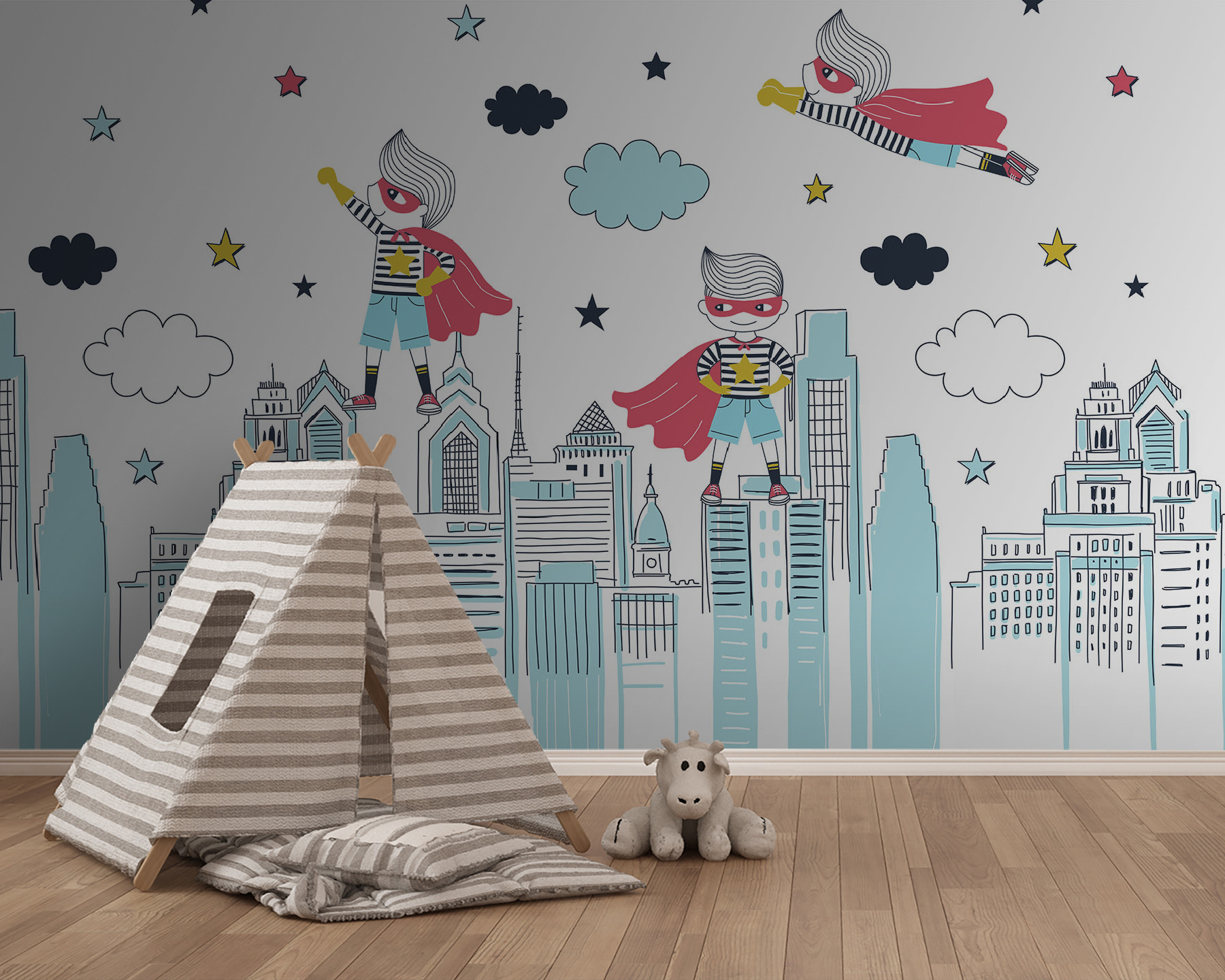 Trasformate la cameretta di un bambino in una vibrante avventura con questo murale raffigurante un giocoso supereroe. Su uno sfondo luminoso, una figura a mantello sfreccia su un paesaggio urbano, circondato da nuvole stravaganti e stelle scintillanti. Non è solo una decorazione, ma stimola l’immaginazione e i sogni di imprese eroiche! Perfetto per i più piccoli, questo murale potrebbe ispirare epiche storie della buonanotte e innumerevoli ore di gioco. Che si tratti di una sorpresa per un compleanno o di un semplice aggiornamento, questo murale può far sentire la stanza come un’evasione divertente. Chi non vorrebbe saltare in un mondo di avventure ogni volta che vi entra?
