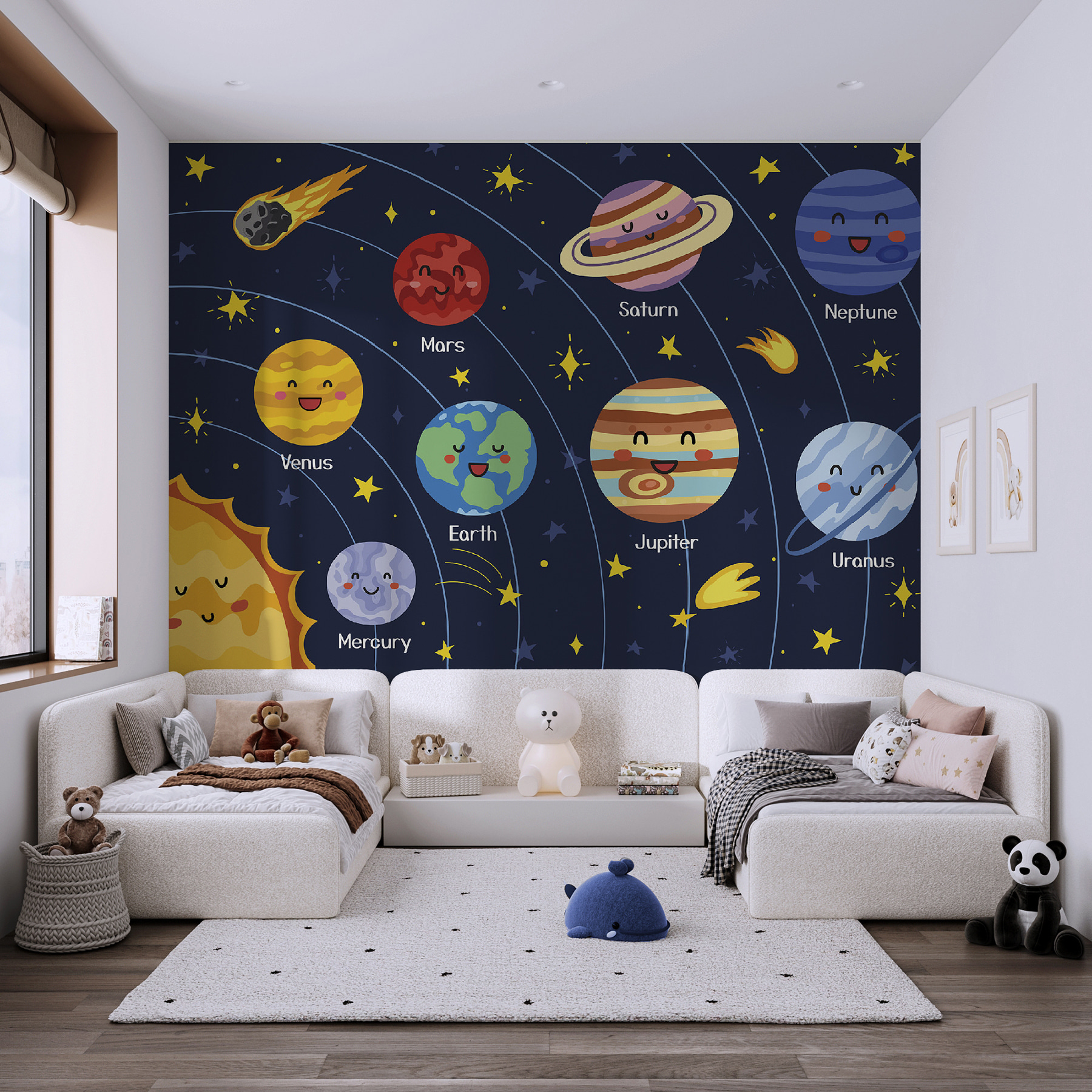 Volete ravvivare la stanza del vostro bambino con un fascino fuori dal mondo? Date un’occhiata a questo adorabile murale “Cartoon of a Planet”! Perfetto per i piccoli astronauti e gli amanti delle stelle, presenta una divertente e colorata galassia. I pianeti hanno le facce più simpatiche e chiedono quasi di darsi il cinque. Immaginate che il viso del vostro bambino si illumini mentre si addormenta in un universo tutto suo.