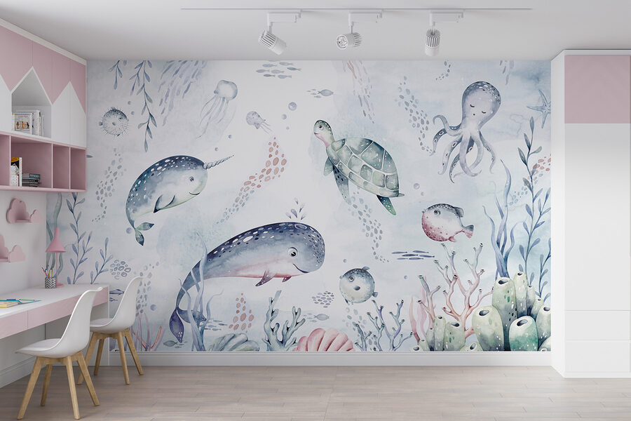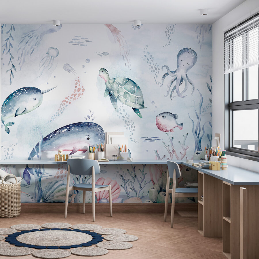 Ciao a tutti! Avete mai pensato di immergervi in un mondo sottomarino da sogno ogni volta che entrate in una stanza? Beh, questo murale ad acquerello è la soluzione che fa per voi. Si tratta di una stravagante esplosione di magia oceanica, con tanto di tartaruga che scivola in un mare incantato. Perfetto per i bambini, i neonati e tutti coloro che amano le atmosfere marine. I colori tenui ma vivaci creano una scena oceanica serena e quasi giocosa, con adorabili creature marine che fluttuano, come se l’oceano stesso avesse dato un bacio alle vostre pareti. Non è solo una decorazione, è una mini-avventura che aspetta di essere vissuta!
