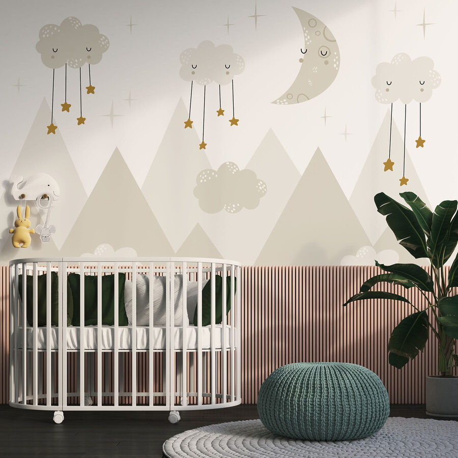 Immaginate questo: un sognante murale del cielo notturno con una luna addormentata e nuvole accoglienti appese a stelle, che risplendono dolcemente sulle cime delle montagne. È come entrare in una stravagante storia della buonanotte! Perfetto per la cameretta dei bambini, questo murale unisce immaginazione e comfort, stimolando la creatività dei più piccoli e creando un’atmosfera rilassante. Pensate a tutti quei sogni d’oro e alle risate della buonanotte. Inoltre, a chi non piacerebbe addormentarsi sotto una scena così deliziosa e rilassante? È più di una semplice decorazione: è una piccola avventura, proprio sulla parete.