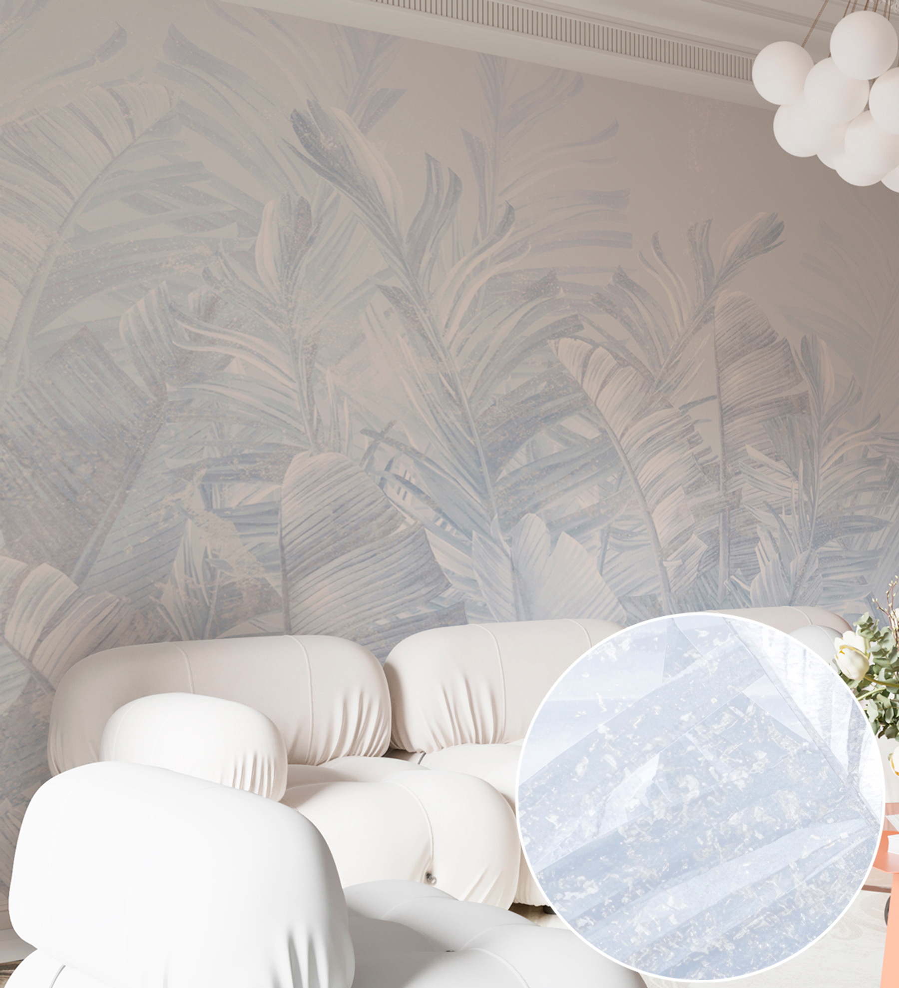 Il rivestimento vinilico è un sottile strato di PVC applicato a una base di tessuto non tessuto. La presenza del vinile rende la carta da parati resistente ai danni, consente una facile pulizia con una spugna umida e conferisce alla superficie una texture in rilievo, simile al tessuto di lino.