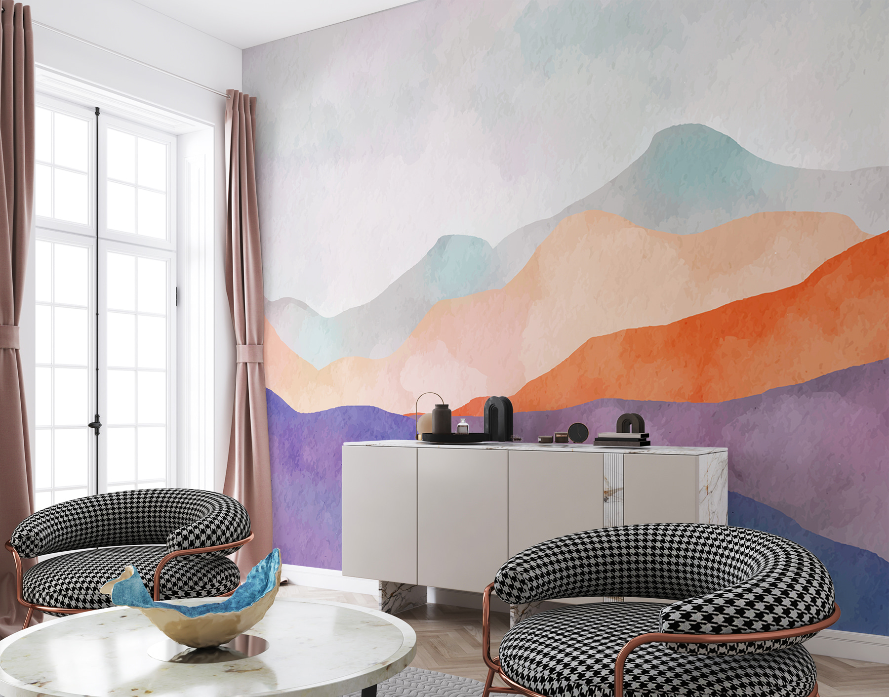 Avete mai pensato di passeggiare in un paesaggio da sogno acquerellato proprio nel vostro salotto? Questa è l’atmosfera che si respira con questo murale. È come se qualcuno avesse catturato l’essenza di una soffice e nebbiosa mattina in montagna e l’avesse spruzzata sulla vostra parete. La miscela di colori è così rilassante: blu pastello, arancioni delicati e viola che si fondono insieme come un tramonto sereno. Immaginate di sorseggiare il vostro caffè, alzare lo sguardo e sentirvi immediatamente rilassati, quasi come se foste affacciati alla finestra di una baita su cime lontane. Perfetto per tutti coloro che amano le vibrazioni della natura.
