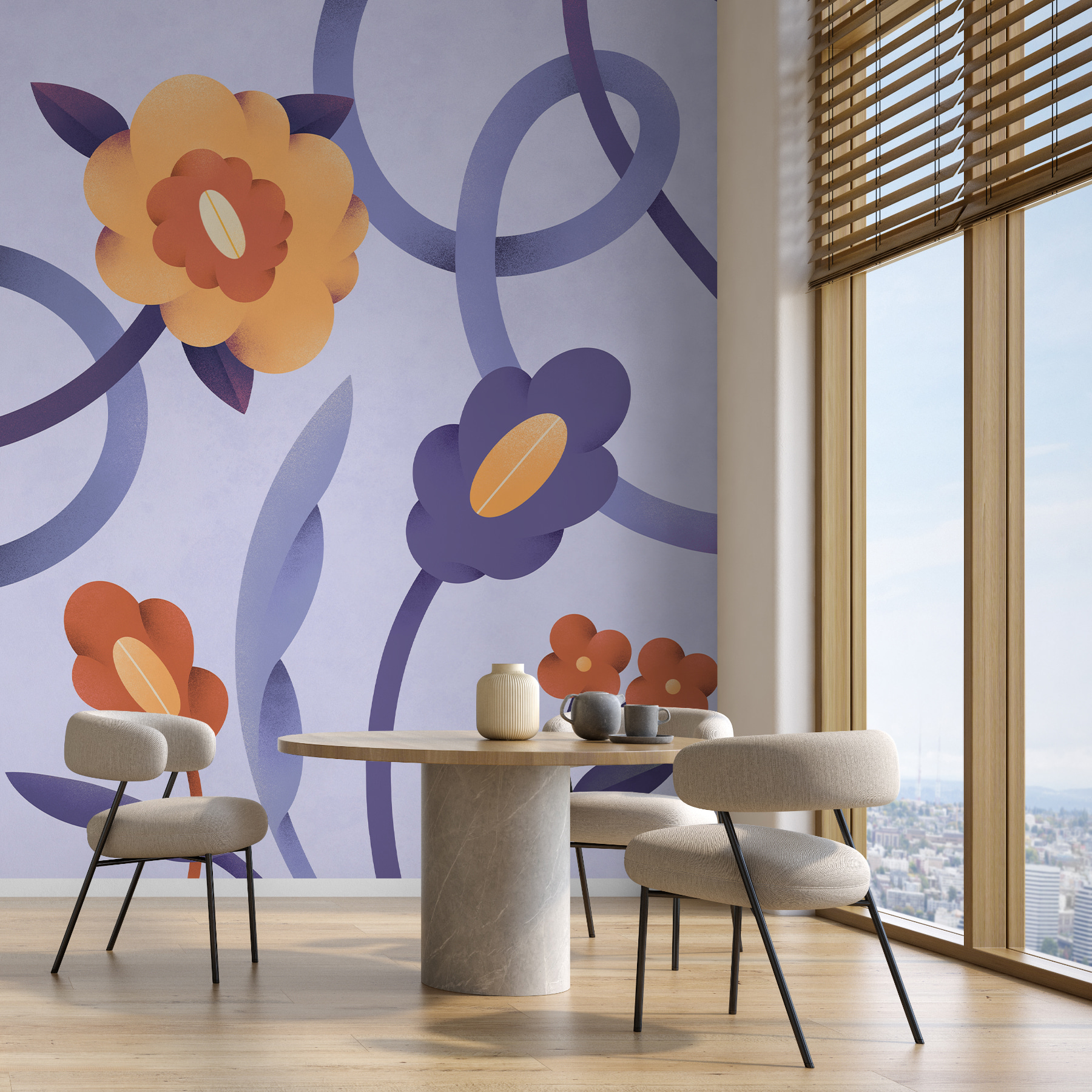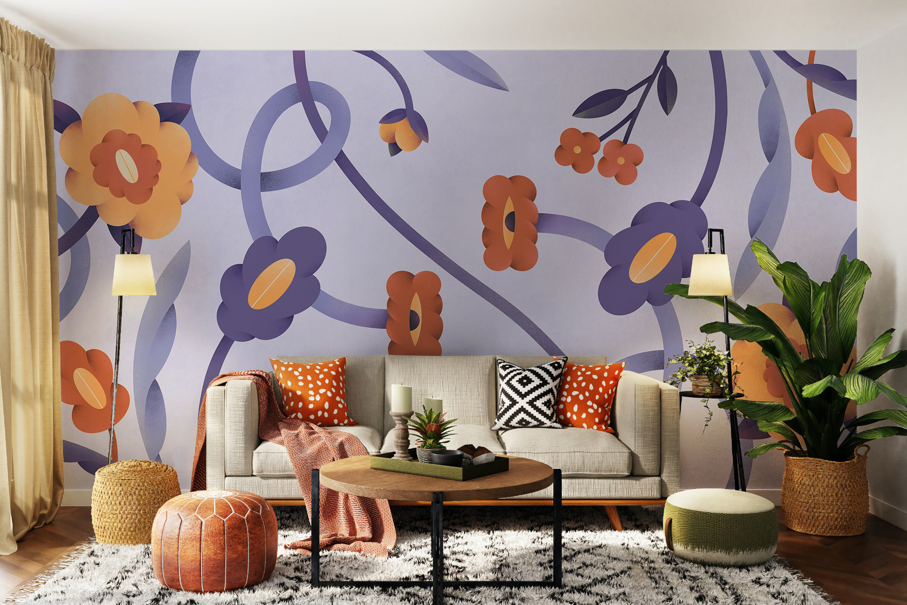 “Murales viola e arancione con fiori e viti” è come entrare in un giardino allegro e sognante. Quelle viti e quei fiori intrecciati in un audace viola e in un solare arancione sprizzano energia da tutti i pori. Immaginatevi di svegliarvi davanti a questa scena vibrante: il buonumore è immediato! È come avere un tocco d’estate direttamente sulla parete, indipendentemente dalla stagione.