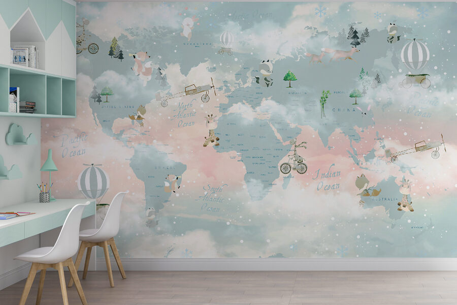 Questo murale “Mappa del mondo con nuvole e animali” non è la solita decorazione murale: è un’avventura stravagante che aspetta solo di essere vissuta! Perfetto per i piccoli esploratori e sognatori, presenta una mappa dai colori tenui e pastello con affascinanti illustrazioni di animali e soffici nuvole. Immaginate che il vostro bambino o la vostra bambina guardino questo murale e intraprendano un viaggio immaginario dal Nord America all’Africa, con curiosi animaletti come compagni di viaggio.