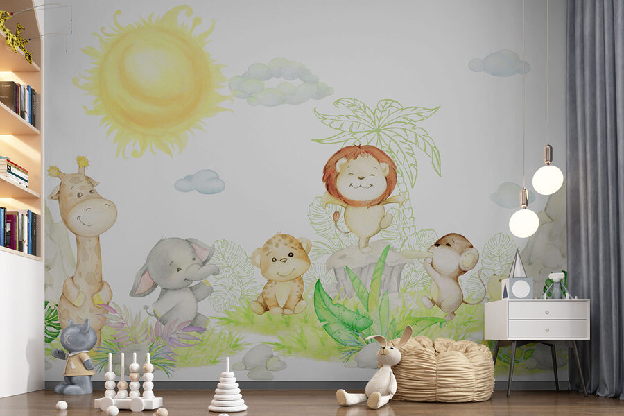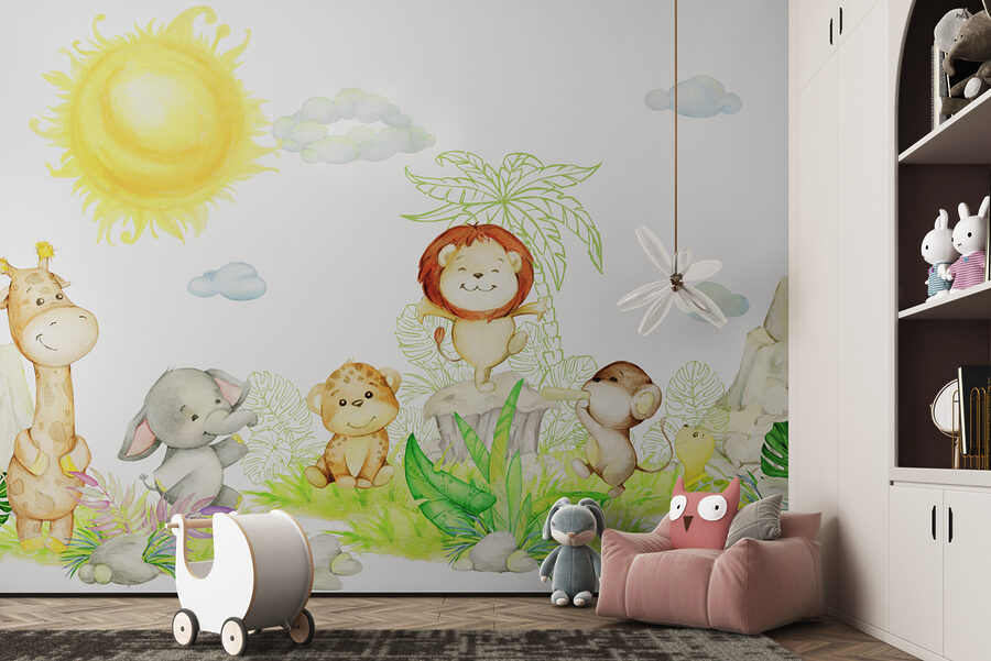 Il murales Giraffe with a Smile è una delizia assoluta! Immaginate questa allegra giraffa che vi sorride, perfetta per aggiungere un tocco di allegria alla stanza di qualsiasi bambino. È anche in buona compagnia: circondata da un’adorabile banda di amici della giungla sotto un grande sole felice. Elefanti, leoni e persino una scimmietta impertinente. È come avere un mini safari direttamente sulla parete!