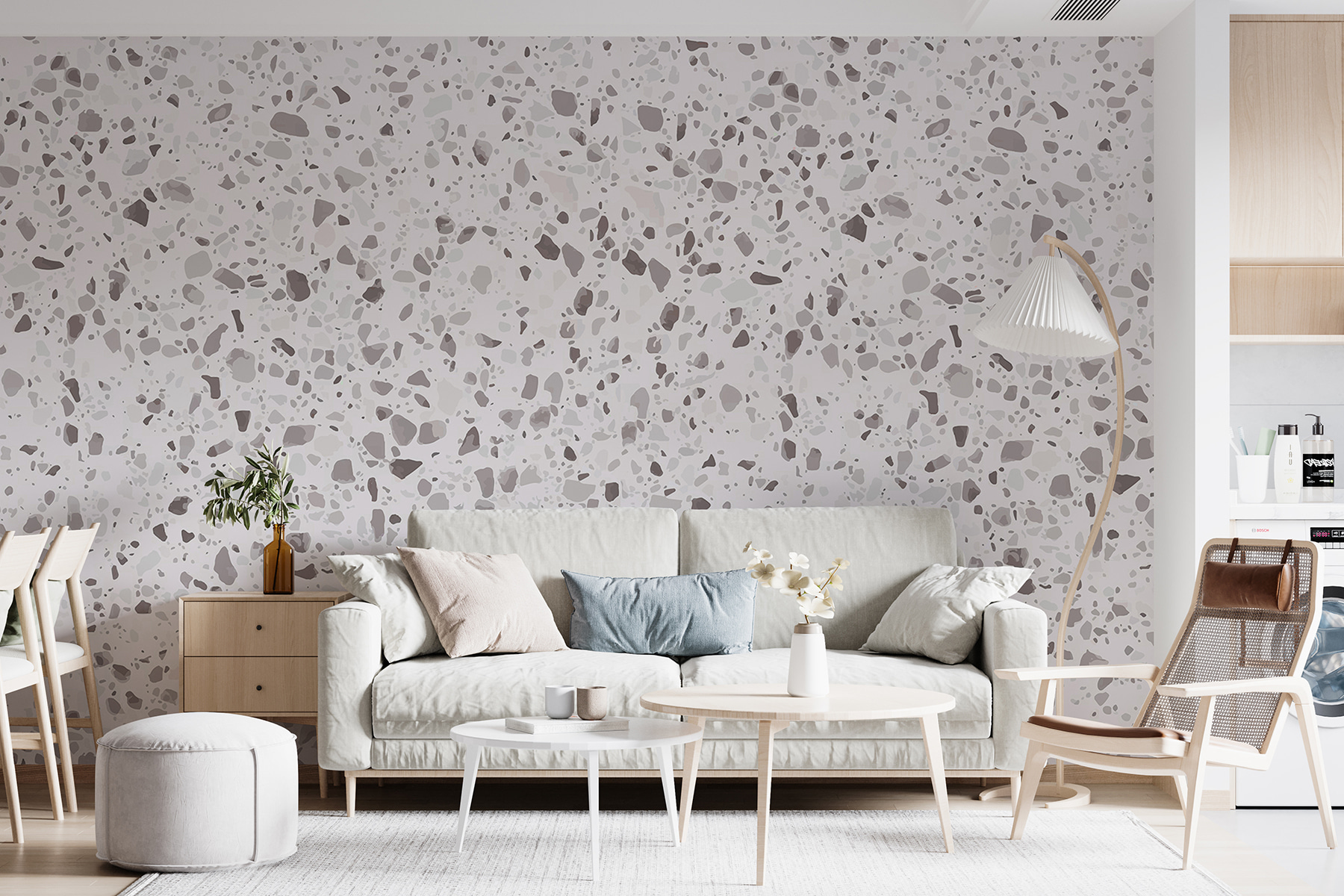 Vi è mai capitato di entrare in una stanza e di sentirvi… tranquilli? Questo è il risultato di questo murale “White and Gray Speckled Surface”. È una sorta di versione chic di Terrazzo, con le sue delicate macchie grigie e bianche che creano una dichiarazione sottile ma elegante. Immaginatelo nel vostro salotto o magari in un elegante ufficio. Ha un’atmosfera disinvolta e cool, senza sforzarsi troppo. Pulito, moderno e un po’ artistico, è perfetto per creare quei momenti di zen. Inoltre, è versatile e si abbina bene a qualsiasi stile di arredamento. Immaginate il caffè del mattino con questo sfondo: è proprio il caso, no?