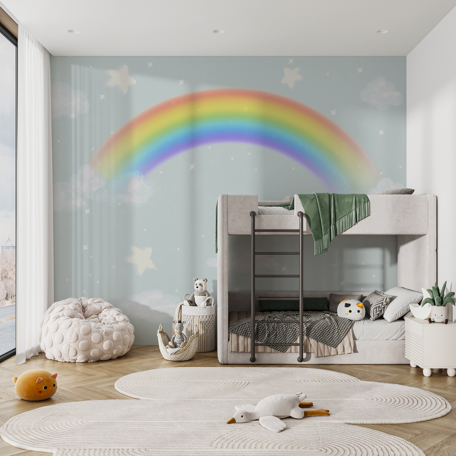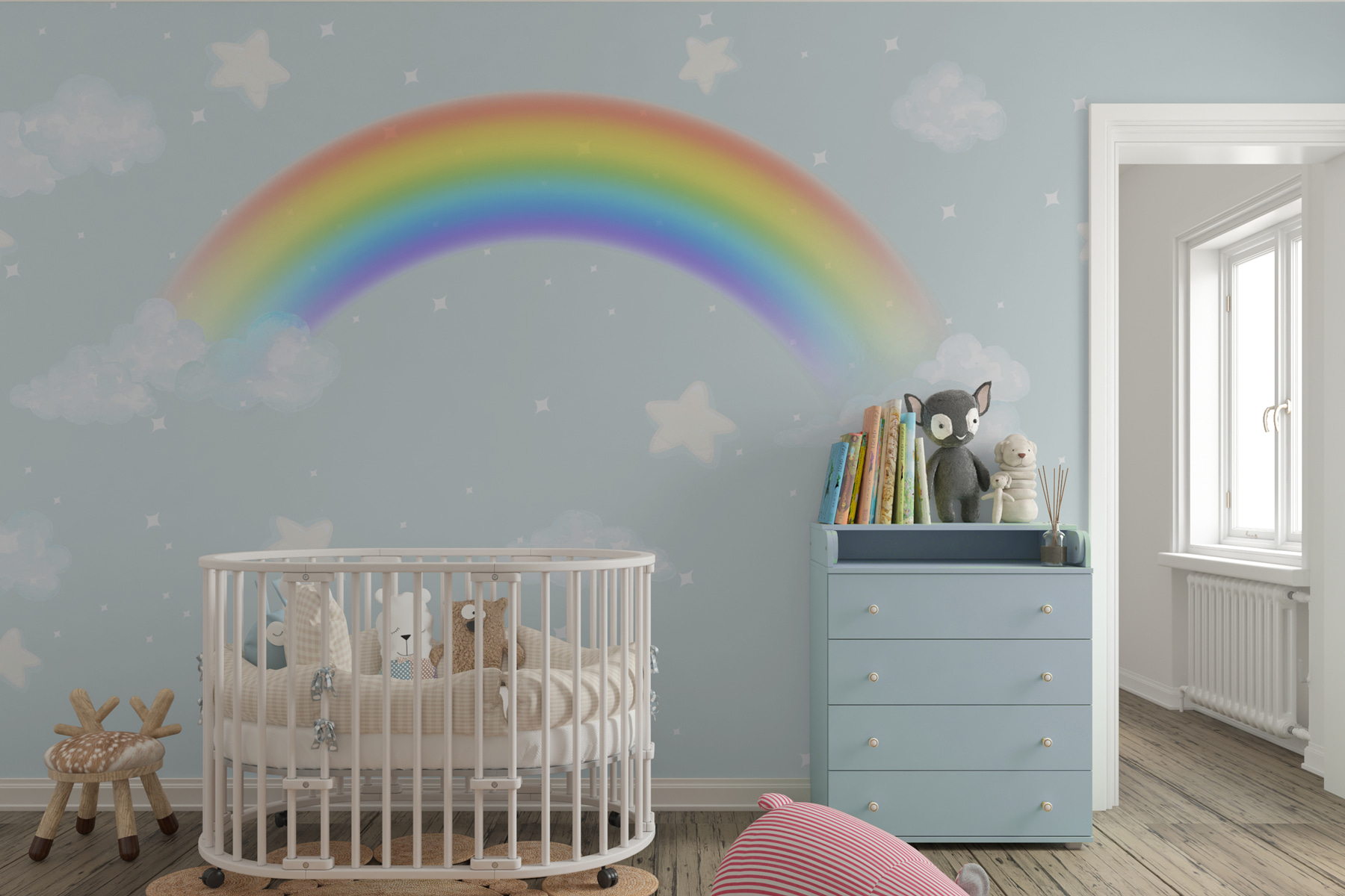 Questo murale non è solo bello, ma anche magico. Immaginate di rilassarvi in una giornata di pioggia, con la cioccolata calda in mano, mentre questo murale porta una ventata di aria fresca e un tocco di colore. Potreste perdervi nel sereno sfondo blu o inventare storie sulle stelle e sulle nuvole con i vostri bambini. È amichevole, invitante e fa sentire immediatamente la stanza più grande e luminosa.