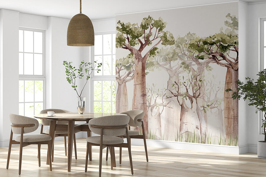 Immergetevi in un paesaggio da sogno con il murale “Majestic Baobabs in Watercolor Forest”, perfetto per trasformare qualsiasi spazio in una stravagante foresta. Immaginate di entrare in una stanza dove questi imponenti baobab vi accolgono con il loro fascino delicato e acquerellato. I bambini lo adoreranno, sentendosi dei piccoli esploratori in una foresta rigogliosa e magica. Le tonalità tenui conferiscono un’atmosfera accogliente e naturale, aggiungendo un pizzico di misticismo. Pensate a una cameretta o a una stanza dei giochi trasformate in un rifugio incantato; è come se l’ora della fiaba fosse appena stata aggiornata. I verdi tenui e i toni della terra sono super calmanti e lo rendono ideale per un angolo di lettura o anche come sfondo per il relax quotidiano. È proprio quello che ci vuole per chi vuole portare un tocco di tropici e una spruzzata di creatività nella propria casa. Preparatevi a ricevere tutti i complimenti e forse anche qualche “ooh” e “aah”!