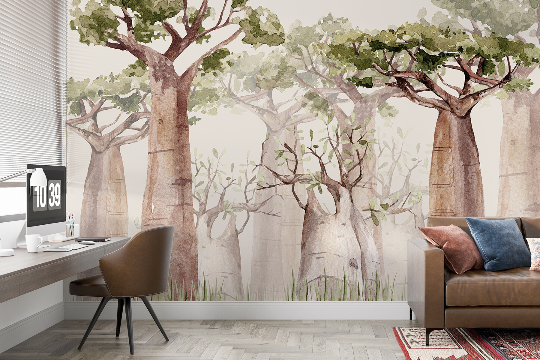 Immergetevi in un paesaggio da sogno con il murale “Majestic Baobabs in Watercolor Forest”, perfetto per trasformare qualsiasi spazio in una stravagante foresta. Immaginate di entrare in una stanza dove questi imponenti baobab vi accolgono con il loro fascino delicato e acquerellato. I bambini lo adoreranno, sentendosi dei piccoli esploratori in una foresta rigogliosa e magica. Le tonalità tenui conferiscono un’atmosfera accogliente e naturale, aggiungendo un pizzico di misticismo. Pensate a una cameretta o a una stanza dei giochi trasformate in un rifugio incantato; è come se l’ora della fiaba fosse appena stata aggiornata. I verdi tenui e i toni della terra sono super calmanti e lo rendono ideale per un angolo di lettura o anche come sfondo per il relax quotidiano. È proprio quello che ci vuole per chi vuole portare un tocco di tropici e una spruzzata di creatività nella propria casa. Preparatevi a ricevere tutti i complimenti e forse anche qualche “ooh” e “aah”!
