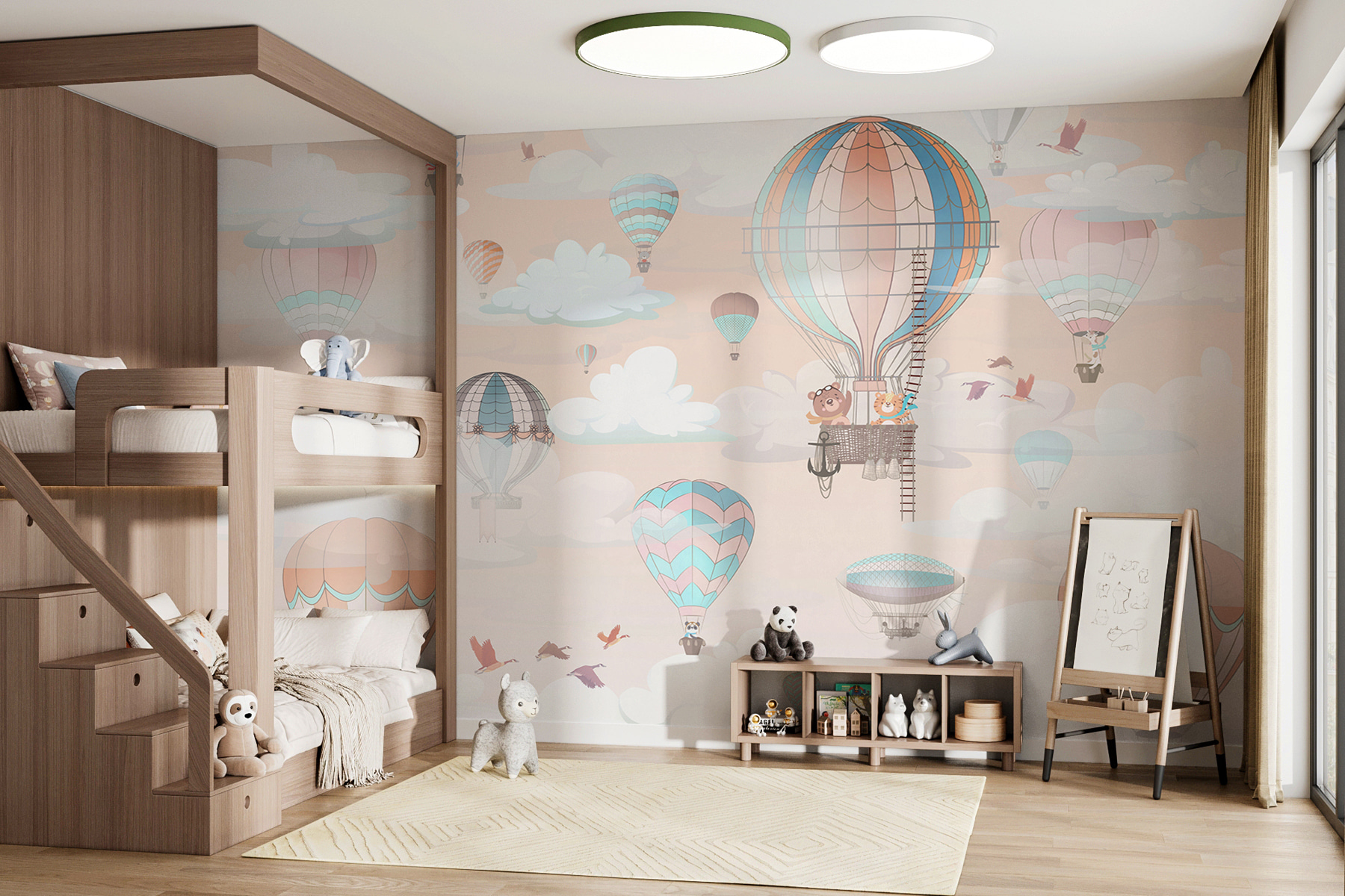 Questo murale “Mongolfiera nel cielo” è come un sogno ad occhi aperti. Immaginate che i più piccoli si sveglino ogni mattina con un cielo pieno di mongolfiere stravaganti che fluttuano tra soffici nuvole. È un’affascinante miscela di colori pastello tenui, perfetta per creare uno spazio sereno e gioioso. Immaginate storie della buonanotte ambientate in terre lontane o pomeriggi di gioco con gli amici, ispirati da questa avventura aerea. Non si tratta solo di un murale, ma di un intero stato d’animo, leggero, giocoso e assolutamente magico. Ideale per le camerette o le stanze dei bambini, porta un tocco di divertimento e di immaginazione senza fine.