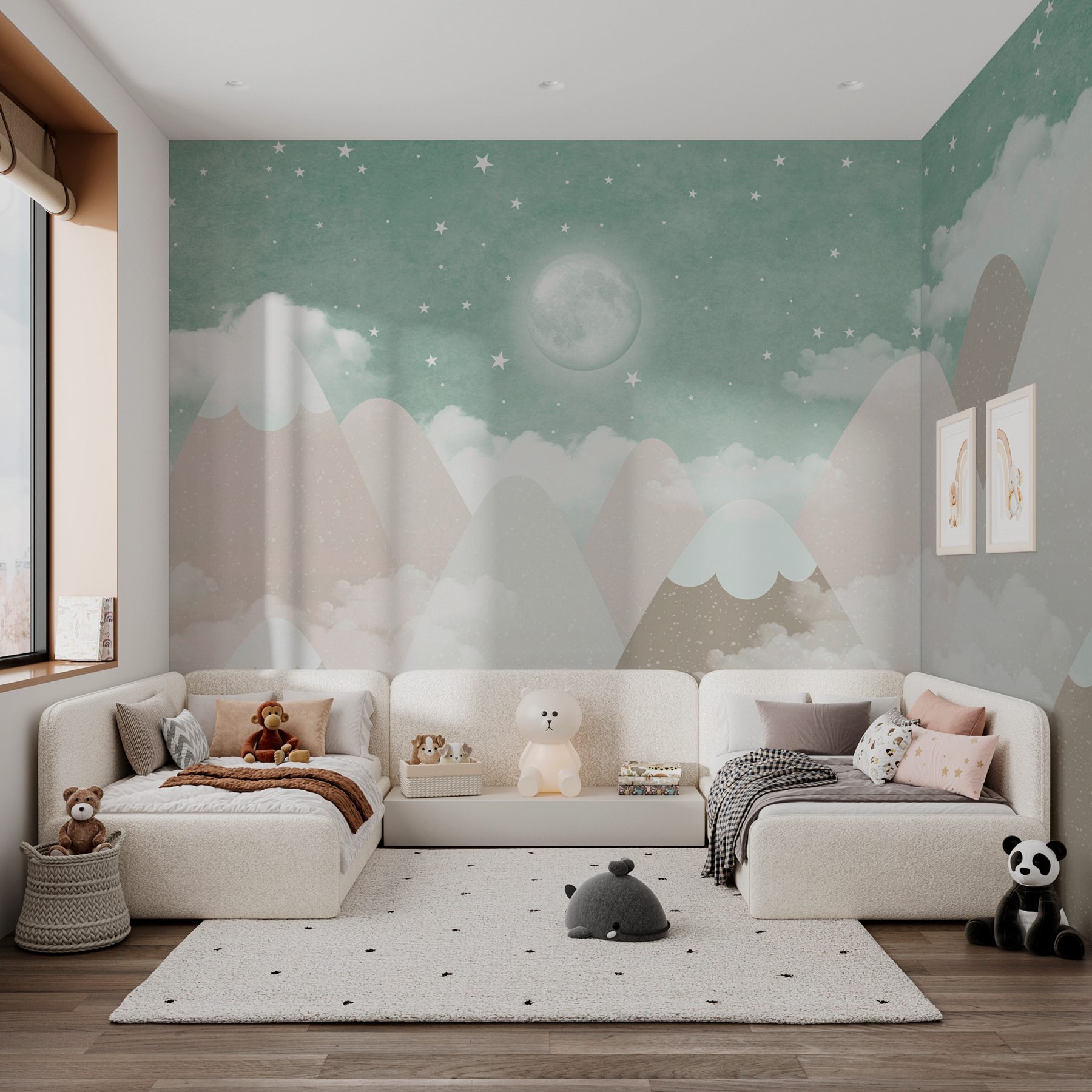 Immaginate di addormentarvi sotto un cielo pieno di stelle, con una dolce luna che illumina le dolci colline sottostanti. Questo murale “Moon and Stars in the Sky” è come un’evasione da sogno sulle vostre pareti, perfetto per la stanza di un bambino o di un giovane. Ha un tono magico e pacifico che sussurra sogni d’oro e notti tranquille.