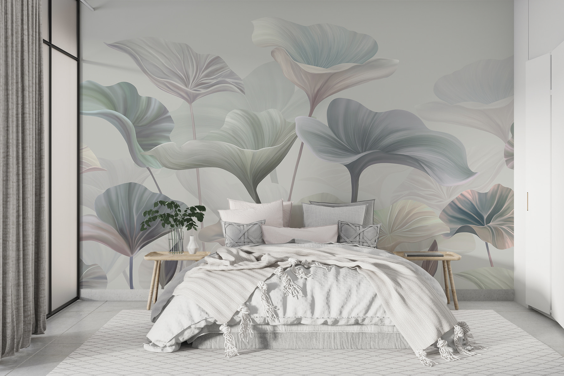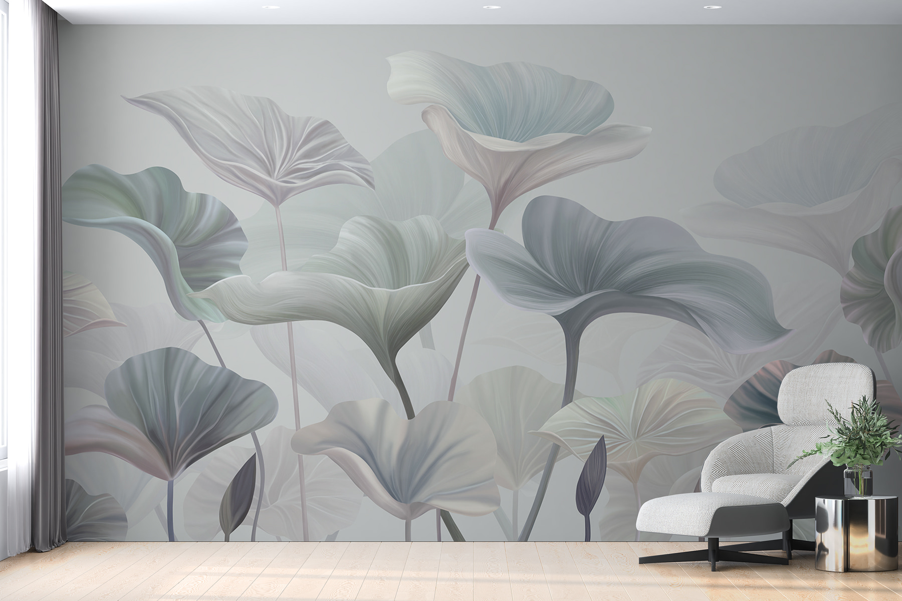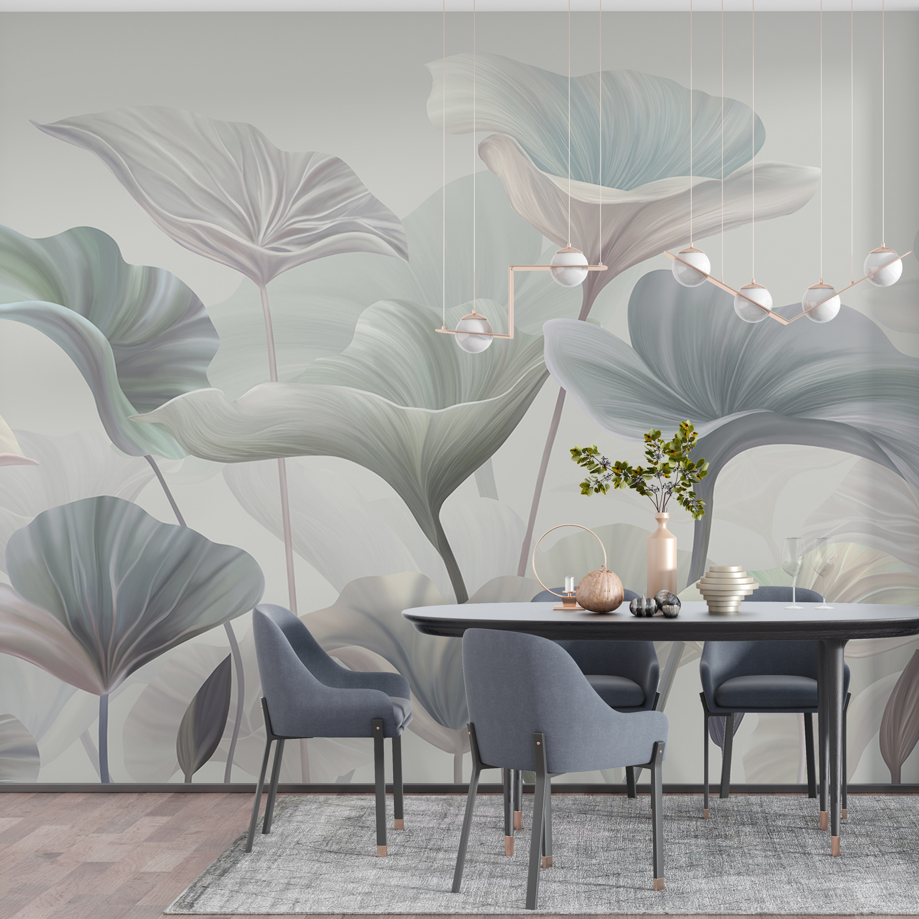 I verdi e i blu delicati conferiscono un’atmosfera sognante, quasi come un sussurro nella brezza. Avete già sognato a occhi aperti? Lo penso anch’io! I dettagli sono così intricati da far pensare che queste foglie e questi fiori stiano per prendere vita. Potreste persino iniziare a cercare le farfalle (sappiamo tutti che lo fareste). Questo murale ha tutto: bellezza, raffinatezza e quel tocco di magia che trasforma una stanza.