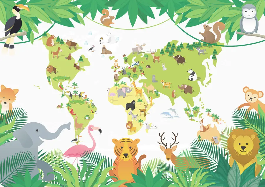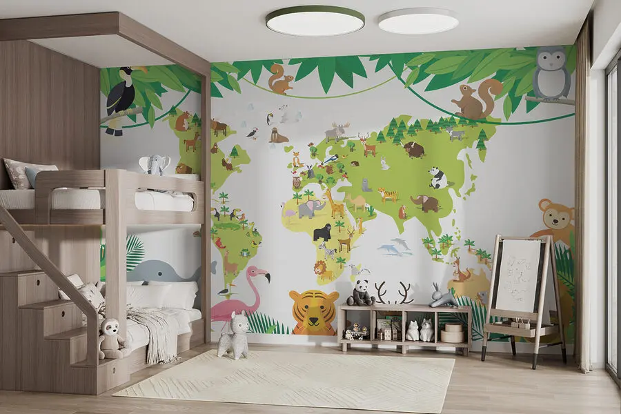 Avete diversi bambini o una stanza dei giochi che ha bisogno di essere ravvivata? Questo murale è perfetto: è come un’opera d’arte che racconta una storia. Immaginate i loro volti illuminarsi quando scoprono tutte le simpatiche creature nascoste tra le foglie o mappate attraverso i continenti.