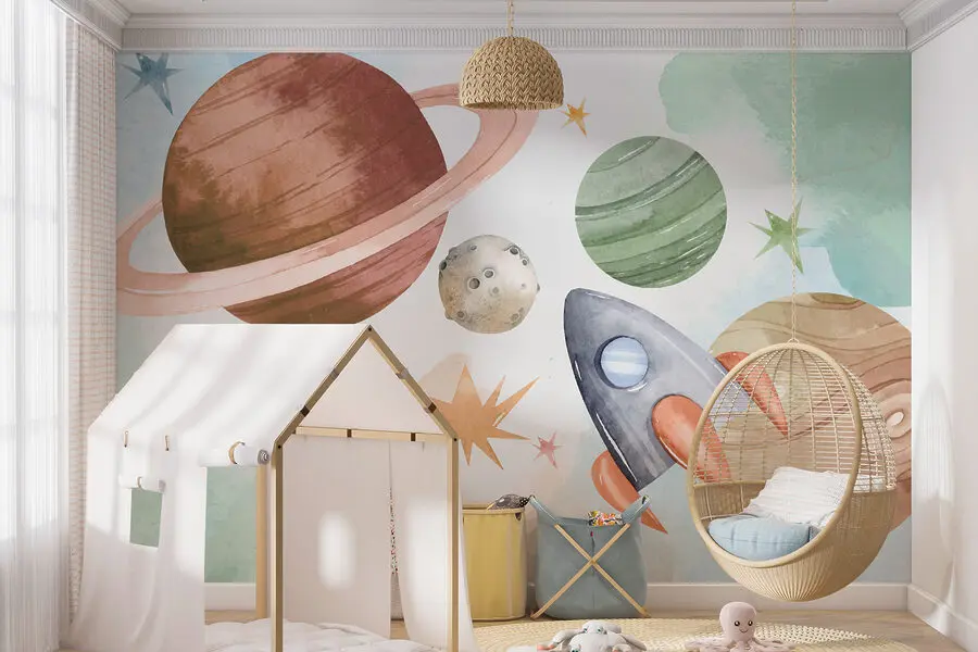 Immaginate questo: entrate in una stanza e boom! C’è un razzo che sfreccia tra pianeti colorati, portando tutta la magia dello spazio direttamente sulle vostre pareti. Questo murale “Rocket flying past colorful planets” è una miscela da sogno di vibranti acquerelli e meraviglie celestiali: è come avere un pezzo di galassia all’interno. Perfetto per i bambini di tutte le età (sì, anche per i “grandi”, cioè gli adolescenti e gli adulti). È destinato ad accendere la curiosità e il senso dell’avventura. Pensate alle storie della buonanotte che si trasformano in epiche missioni spaziali. Decollo!