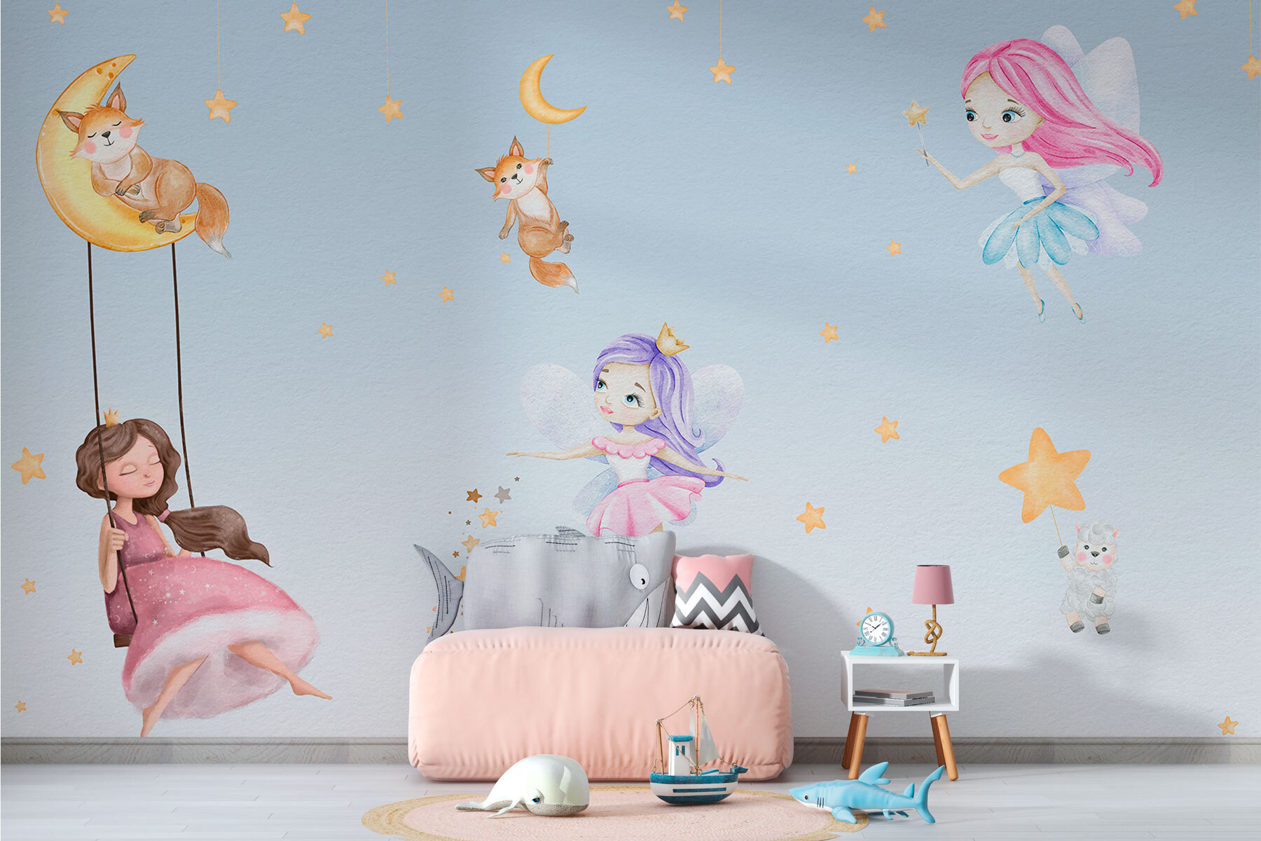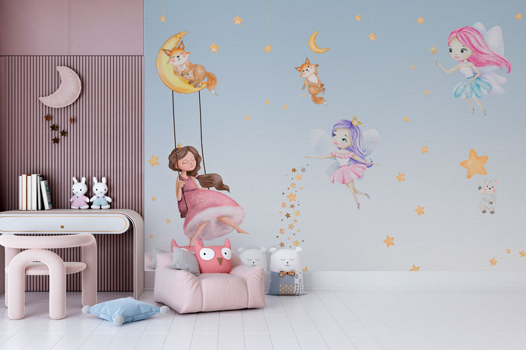 Immaginate di entrare in una stanza e di essere accolti dal fascino stravagante del murale “Girl in a Pink Dress on a Swing”. Perfetto per la stanza di una bambina o per la cameretta, questo murale dà vita a un’atmosfera sognante e fiabesca. Immaginate piccole volpi che si adagiano su mezzelune e stelle che scintillano sullo sfondo: sembra di entrare in un’illustrazione di un libro di fiabe! Le morbide tonalità pastello e i simpatici personaggi faranno sognare a occhi aperti. Non è solo un murale, è come regalare al vostro piccolo una fetta di magico cielo notturno ogni giorno. Ideale per stimolare l’immaginazione e aggiungere un pizzico di magia!