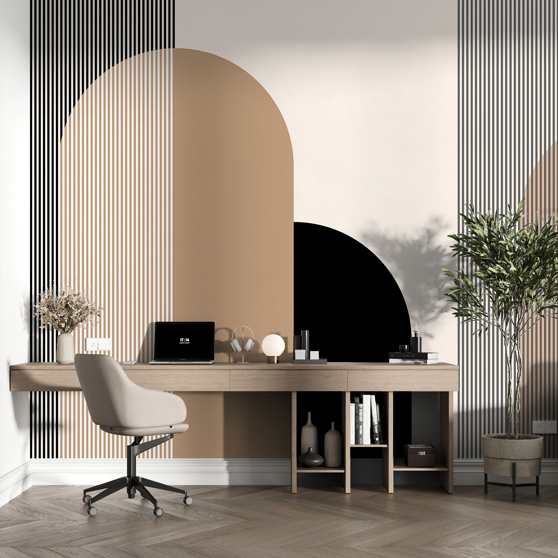 Immaginate di entrare in una stanza e di essere accolti da questo splendido murale: una sinfonia di linee e curve che danzano sulle pareti. Si chiama “Motivo astratto di linee e curve”. Sembra elegante? Ma credetemi, è molto di più. Questo murale ha una miscela perfetta di fascino astratto e semplicità sofisticata, che lo rende un elemento di spicco in qualsiasi spazio. Sia che lo si collochi in un salotto moderno o in un ufficio alla moda, esso eleva immediatamente l’atmosfera.