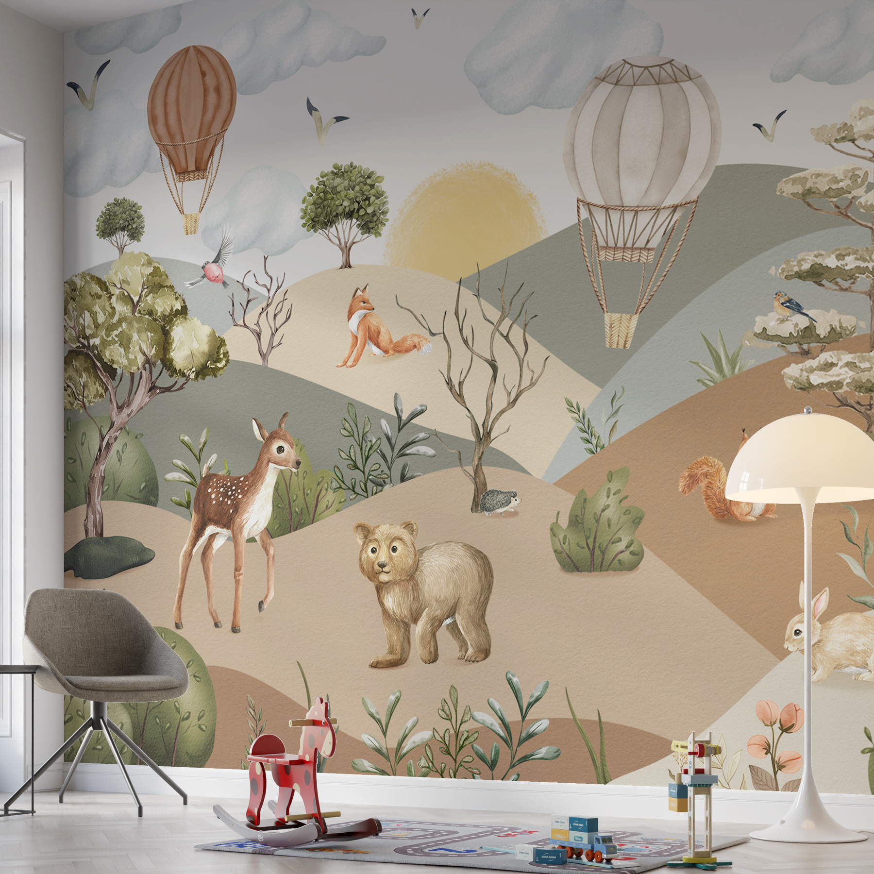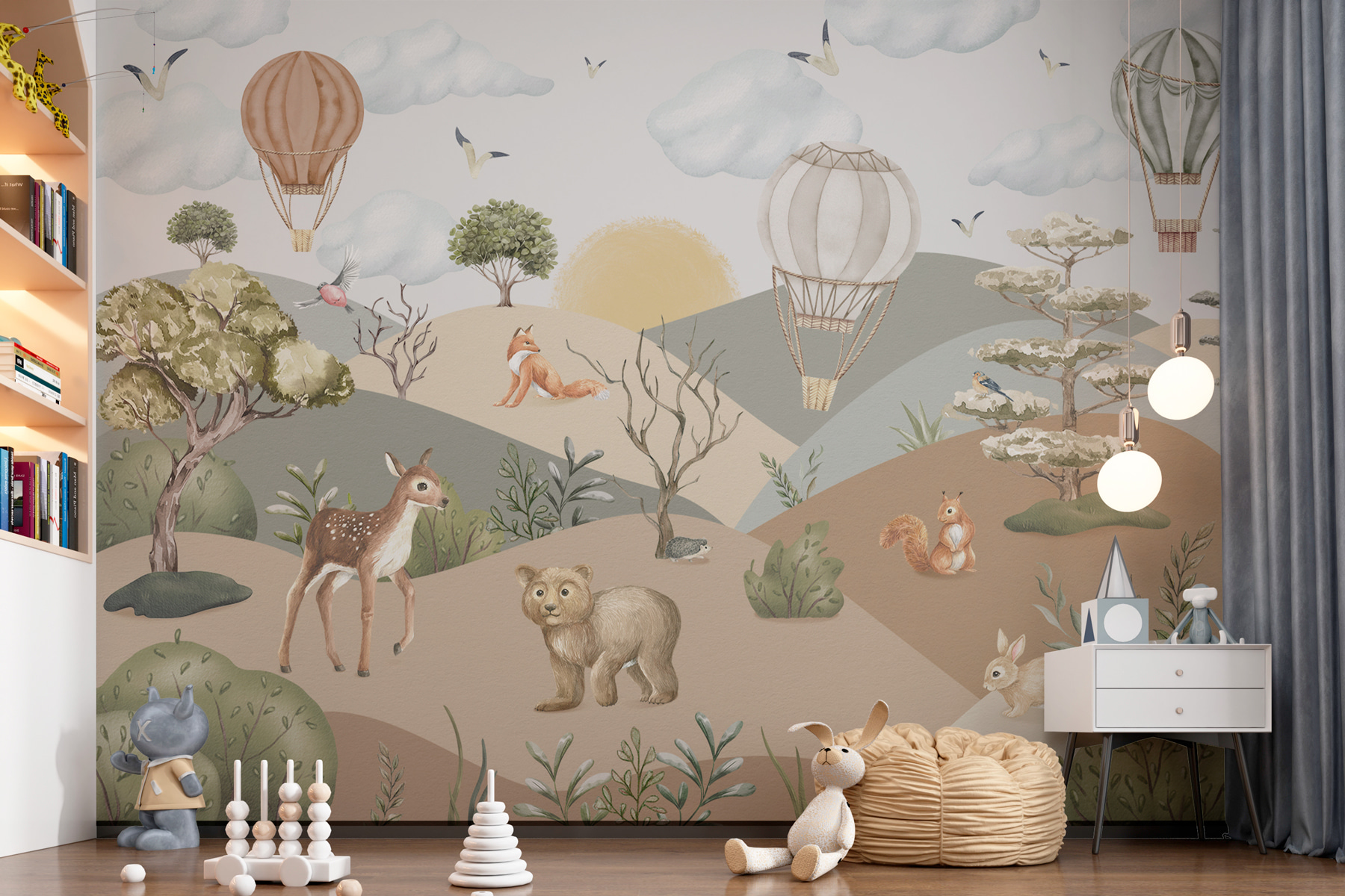 Trasformate una stanza in un’avventura stravagante con questo accattivante murale! È come entrare in un paesaggio da sogno in cui gli animali – cervi curiosi e volpi giocose – si muovono sotto un cielo punteggiato da affascinanti mongolfiere. Perfetto per la camera dei bambini o per un angolo di relax, è pieno di tocchi allegri. Immaginate di svegliarvi con lo sguardo di un orso gentile o di uno scoiattolo gioioso che sgranocchia. I toni tenui e i personaggi giocosi creano un’atmosfera tranquilla, stimolando l’immaginazione e la gioia. Inoltre, è un fantastico spunto di conversazione!