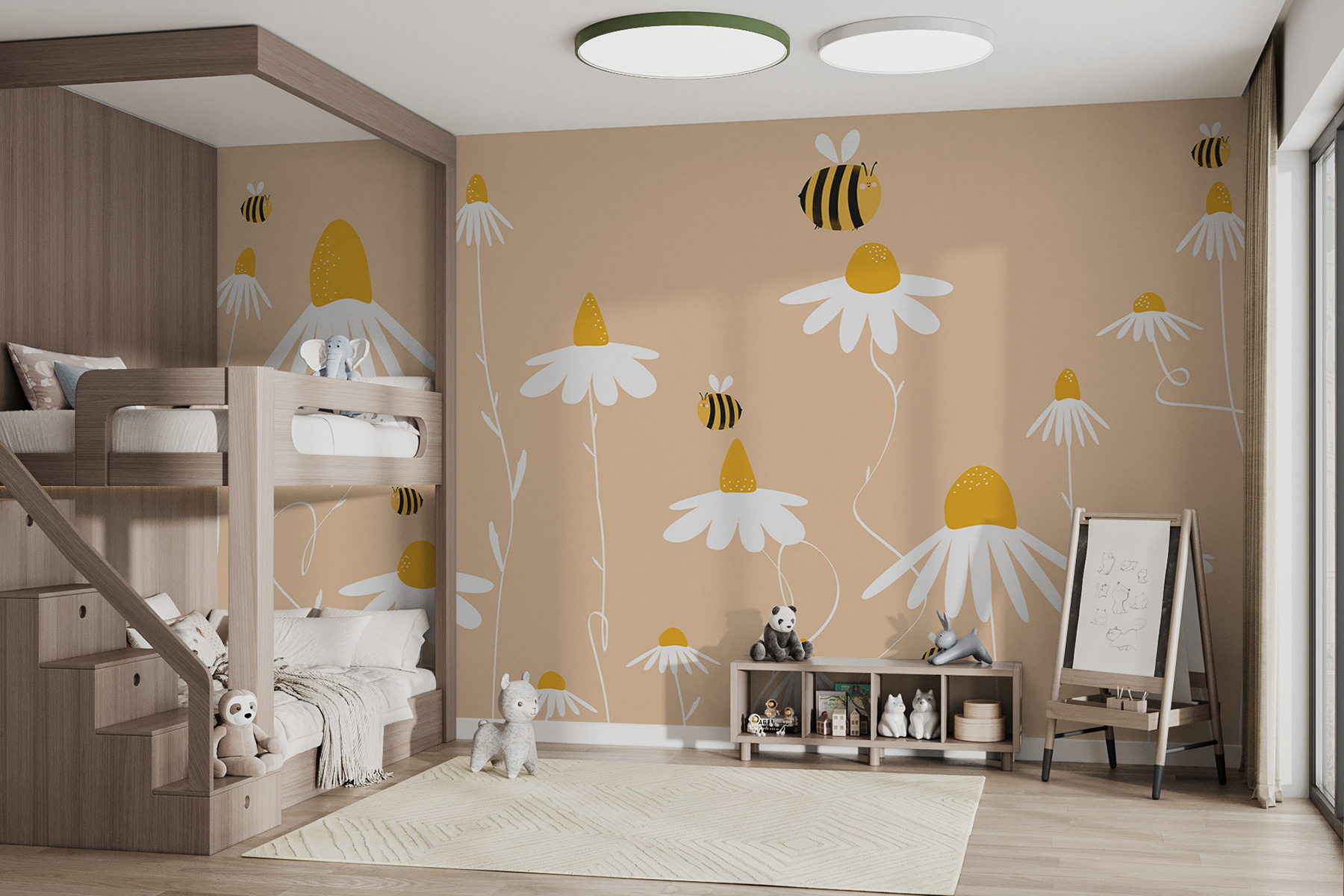 Ma non è solo per i bambini: immaginatelo in un ufficio o in un angolo lettura! È come avere un giardino in casa, ma senza doverlo innaffiare. I colori tenui e il design semplice calmano la mente e aggiungono il giusto tocco di luminosità. Anche nelle giornate più grigie, questo murale mantiene l’umore leggero e allegro.