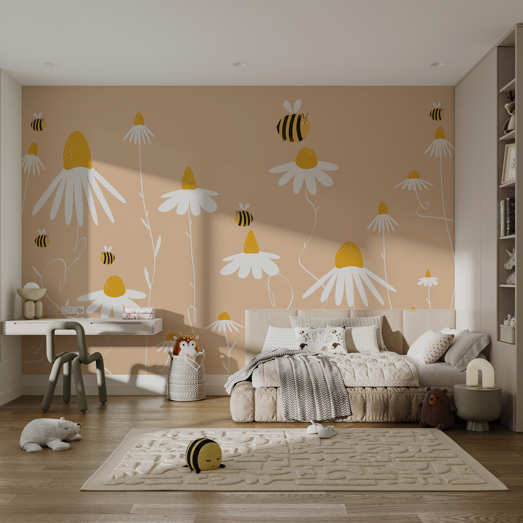 E quelle simpatiche api che ronzano intorno: troppo carine, vero? Aggiungono un tocco delizioso che sembra vivo e ronzante di energia. Che siate giovani o semplicemente giovani di cuore, questo murale ha quel fascino imperdibile che trasforma qualsiasi stanza da “meh” a “meravigliosa”.