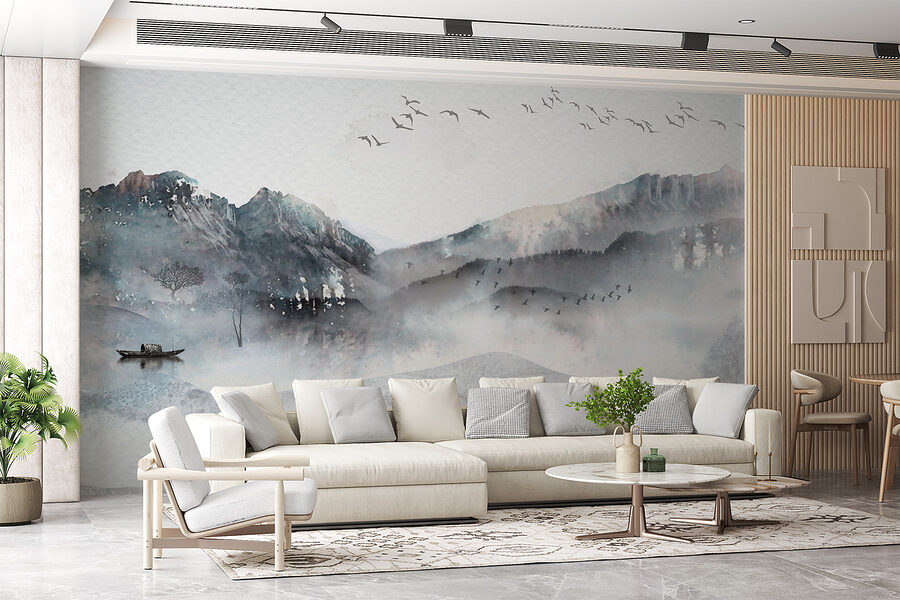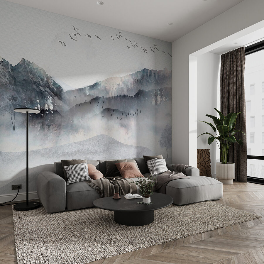 Immaginate di entrare in una stanza e di essere accolti da un sereno gruppo di uccelli che si libra in un cielo da sogno e che vola in alto sopra un paesaggio forestale nebbioso. Questo murale ad acquerello non è solo arte, è un’esperienza. La nebbia rilassante, le morbide colline e le montagne lontane sono un dolce sussurro della natura. Sembra quasi di sentire il sussurro degli alberi e di percepire l’aria fresca e frizzante del mattino che sfiora la pelle.