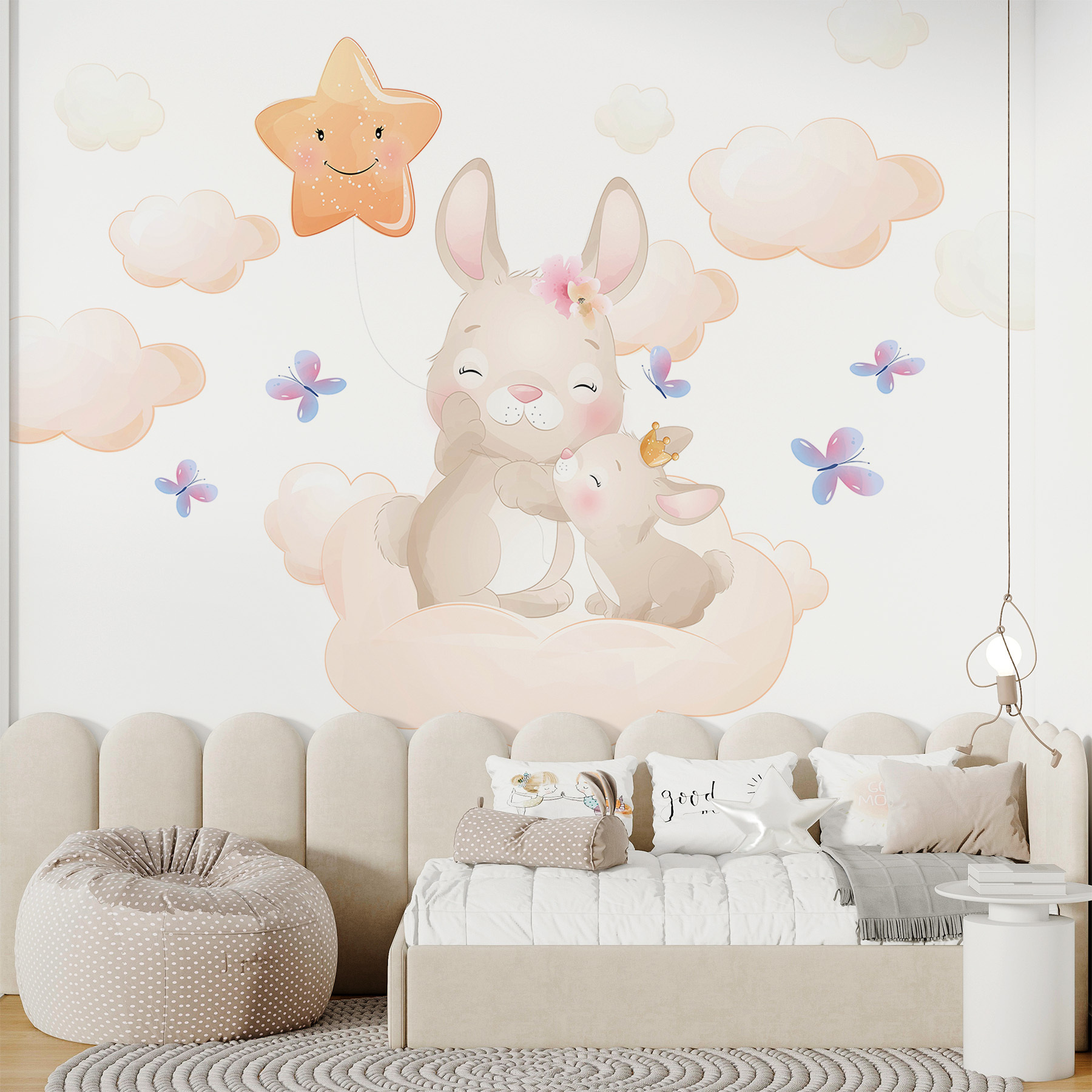 Immaginate di entrare in una stanza dove coniglietti stravaganti, nuvole sognanti e una stella felice vi accolgono con un dolce sorriso: pura magia, vero? Questo murale, “Cartoon of a Star”, porta un pizzico di polvere di stelle e di fascino in ogni spazio. Le nuvole pastello sembrano quasi soffici da toccare e le farfalle? Stanno solo svolazzando per salutare. È come entrare in una fiaba, perfetta per le camerette o le stanze dei giochi dove fiorisce l’immaginazione. I colori tenui e i deliziosi personaggi lo fanno sembrare un dolce abbraccio per le pareti. Ideale per creare storie della buonanotte o semplicemente per aggiungere un pizzico di meraviglia alla vostra quotidianità.