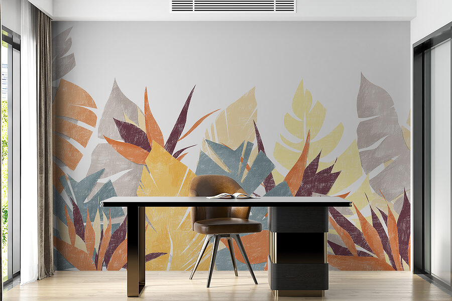 Wow, guardate questo murale, pieno di foglie colorate! Immaginate di tornare a casa ogni giorno con questo spettacolo. È come portare una fetta di avventura tropicale nel vostro salotto. I disegni delle foglie sono così vivaci e variegati che sembra quasi che ondeggino in una dolce e magica brezza.