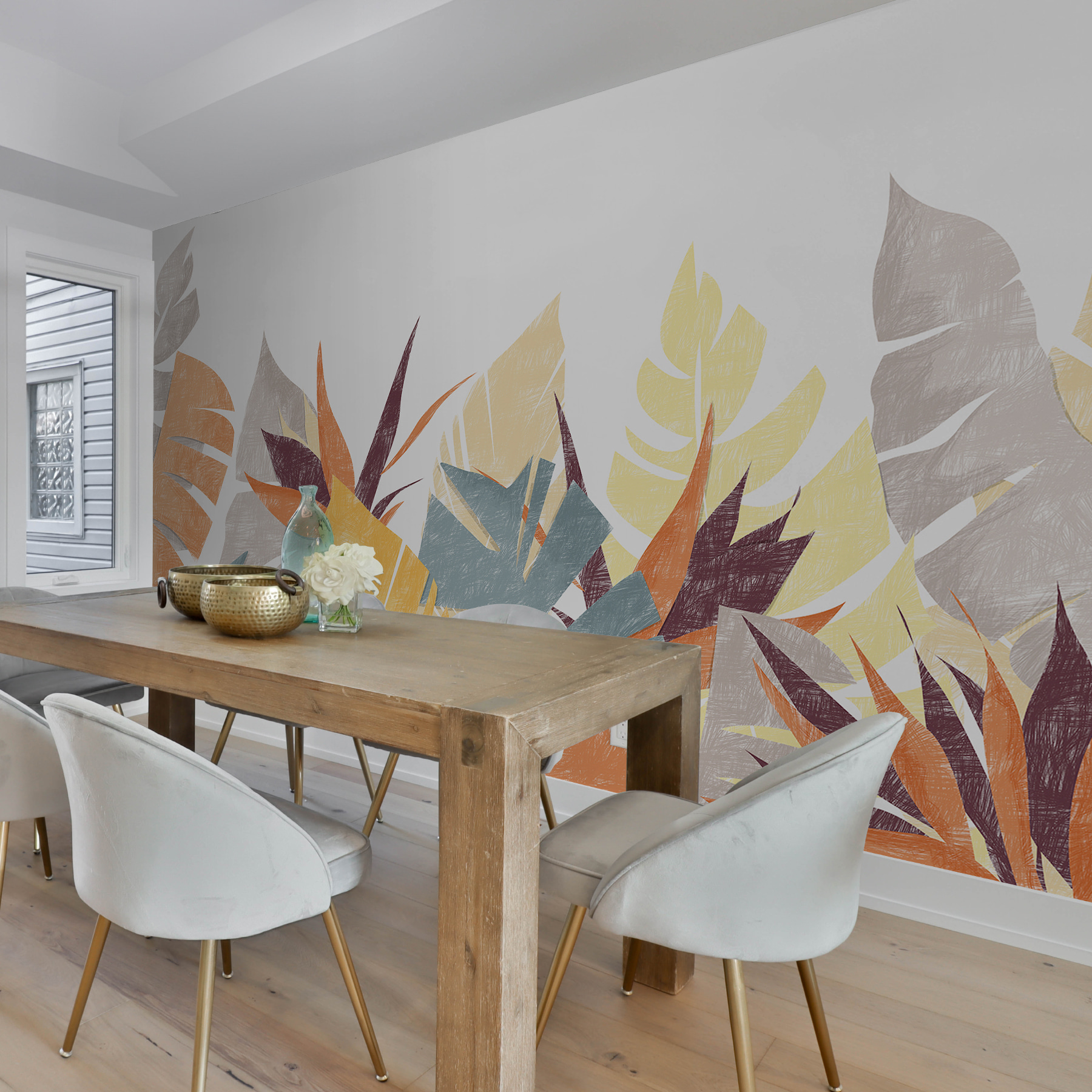 Se amate la natura, le vibrazioni tropicali o semplicemente volete qualcosa di molto più cool di una parete semplice, questo murale vi soddisfa. È giocoso e allo stesso tempo sofisticato: un tocco di colore senza essere troppo appariscente. Inoltre, le calde arance, i blu freddi e le tonalità della terra fanno sentire a proprio agio all’interno. È come se una foresta tropicale incontrasse una tela d’artista, perfetta per trasformare qualsiasi stanza da scialba a favolosa.