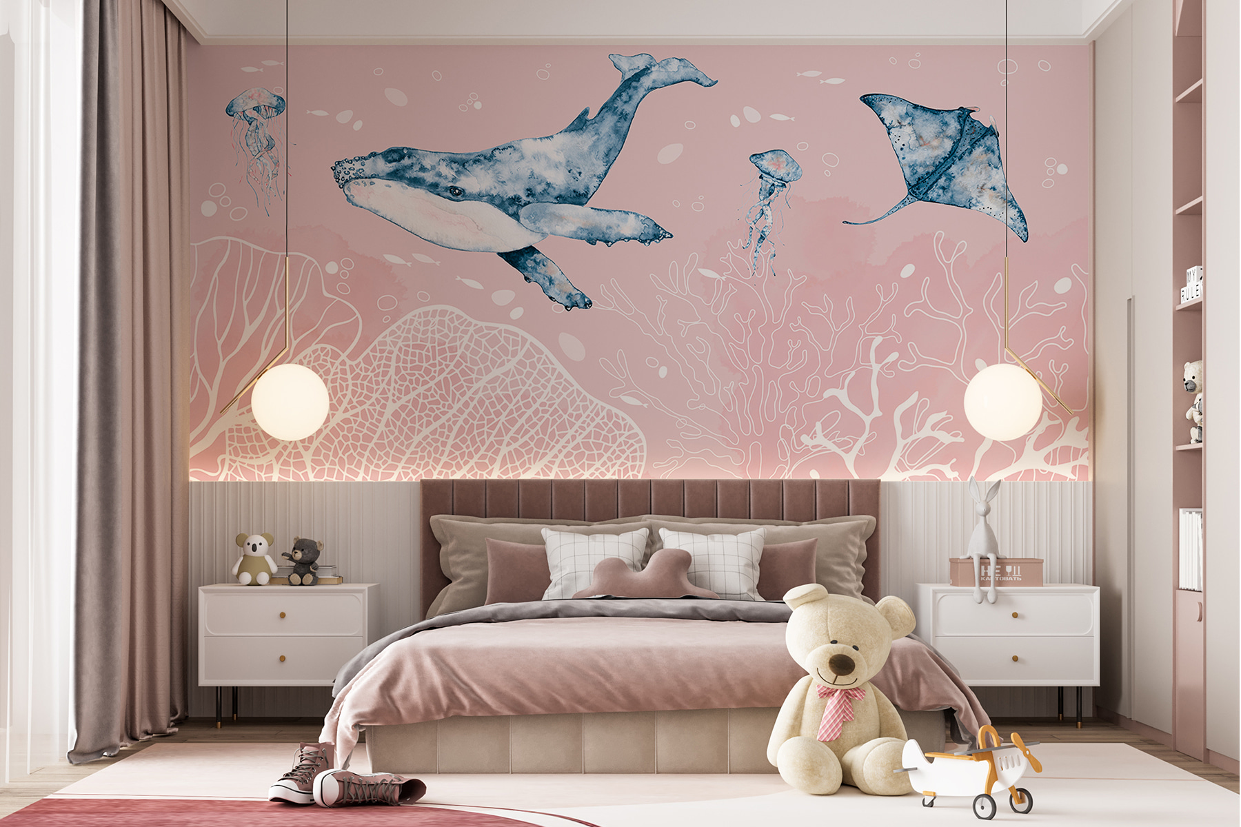 Perfetto per la stanza dei bambini, per uno spazio di lavoro creativo o per qualsiasi altro luogo in cui sia necessario un tocco di tranquillità. Guardate gli occhi dei vostri ospiti illuminarsi con un misto di stupore e curiosità, come se avessero scoperto un giardino sottomarino segreto. Non è solo un murale: è un’esperienza, un motivo di conversazione, uno sfondo rilassante per la vostra vita quotidiana. Immergetevi e lasciate che le onde della creatività e della calma investano il vostro spazio. 🌊🐋
