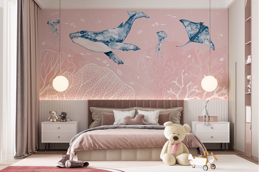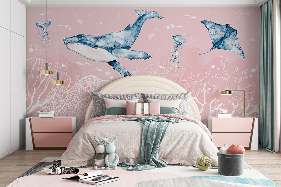 Immaginate di entrare in una stanza e di trovarvi immersi in un sereno mondo sottomarino. Il nostro murale “Acquerello di una balena” è come avere una fetta di oceano direttamente sulla parete. Le sognanti tonalità pastello si fondono senza sforzo, portando un senso di calma e capriccio. Un’elegante balena, graziose meduse e curiose razze fluttuano intorno a voi, facendovi sentire come se vi foste immersi in un mare magico.