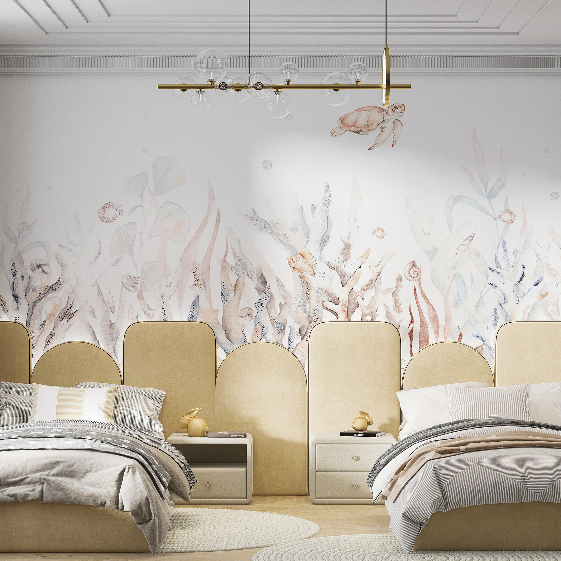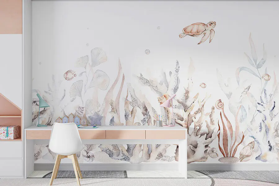 Immaginate la tranquillità della vita marina nel vostro salotto! Questo “Murales vita marina che nuota tra i coralli” è come avere un paradiso sottomarino sulla parete. Coralli vorticosi, pesci giocosi e graziose tartarughe marine conferiscono un’atmosfera fresca e serena, perfetta per qualsiasi stanza che desideri un pizzico di tranquilla eleganza. Immaginate l’ufficio di casa o la camera dei bambini con questo tocco di serenità: è come una mini-vacanza quotidiana senza uscire di casa. Una simpatica tartaruga che fluttua, scivolando con grazia, e che sicuramente vi strapperà un sorriso ogni volta che la vedrete. Lo stile acquerello conferisce un’atmosfera morbida e artistica, quasi come un dipinto da sogno. Se il tema dei pesci o la tranquillità del mare sono la vostra passione, questo murale è perfetto per le vostre pareti. Tuffatevi e aggiungete un tocco di bellezza oceanica al vostro spazio!