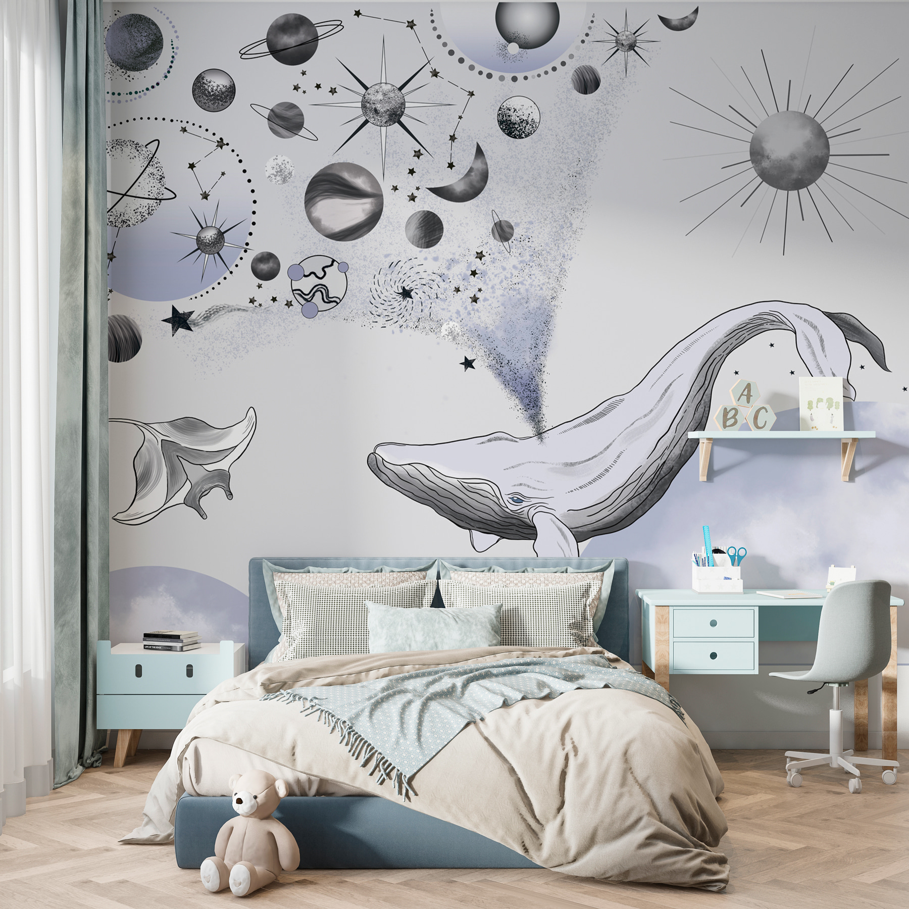 Trasformate qualsiasi spazio con questo murale che sembra una passeggiata in un paese delle meraviglie da sogno. Immaginate una dolce balena che scivola nel cosmo, circondata da vortici di magia stellare e pianeti giocosi. L’atmosfera in bianco e nero gli conferisce un tocco moderno che si adatta a qualsiasi ambiente, dalla camera dei bambini all’accogliente angolo lettura. È un elemento di conversazione che evoca sogni ad occhi aperti di profondità oceaniche e cieli stellati. Immaginate di accoccolarvi con un buon libro, di guardare questo murale e di sentire la scintilla dell’immaginazione. Perfetto per chi ama un pizzico di bizzarria nell’arredamento!