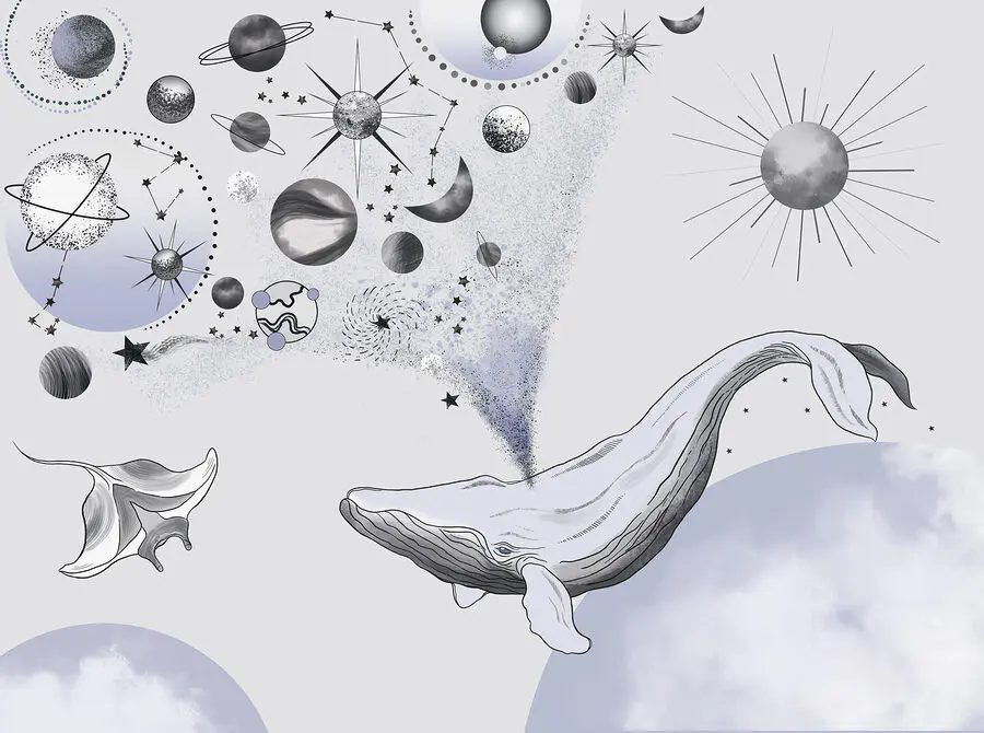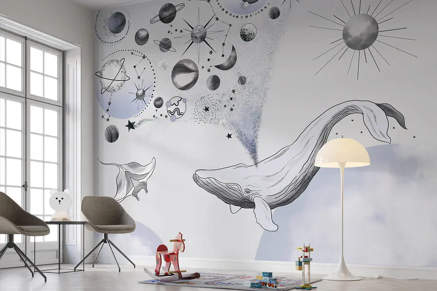 Trasformate qualsiasi spazio con questo murale che sembra una passeggiata in un paese delle meraviglie da sogno. Immaginate una dolce balena che scivola nel cosmo, circondata da vortici di magia stellare e pianeti giocosi. L’atmosfera in bianco e nero gli conferisce un tocco moderno che si adatta a qualsiasi ambiente, dalla camera dei bambini all’accogliente angolo lettura. È un elemento di conversazione che evoca sogni ad occhi aperti di profondità oceaniche e cieli stellati. Immaginate di accoccolarvi con un buon libro, di guardare questo murale e di sentire la scintilla dell’immaginazione. Perfetto per chi ama un pizzico di bizzarria nell’arredamento!