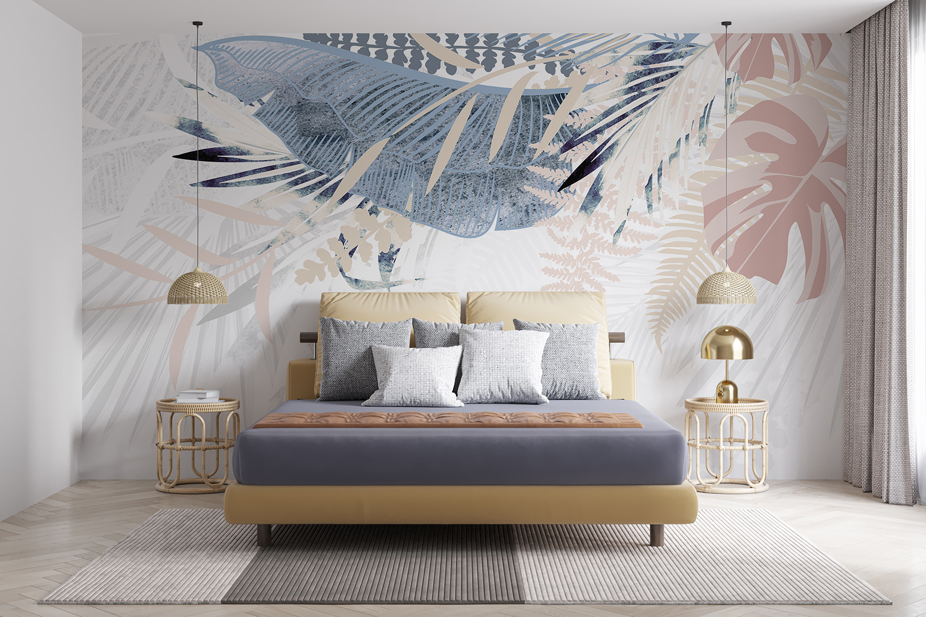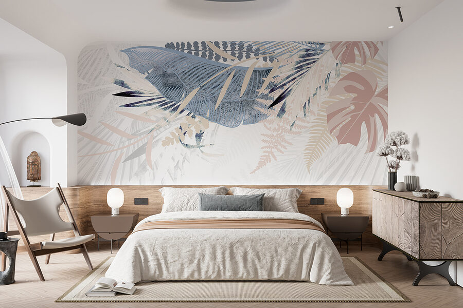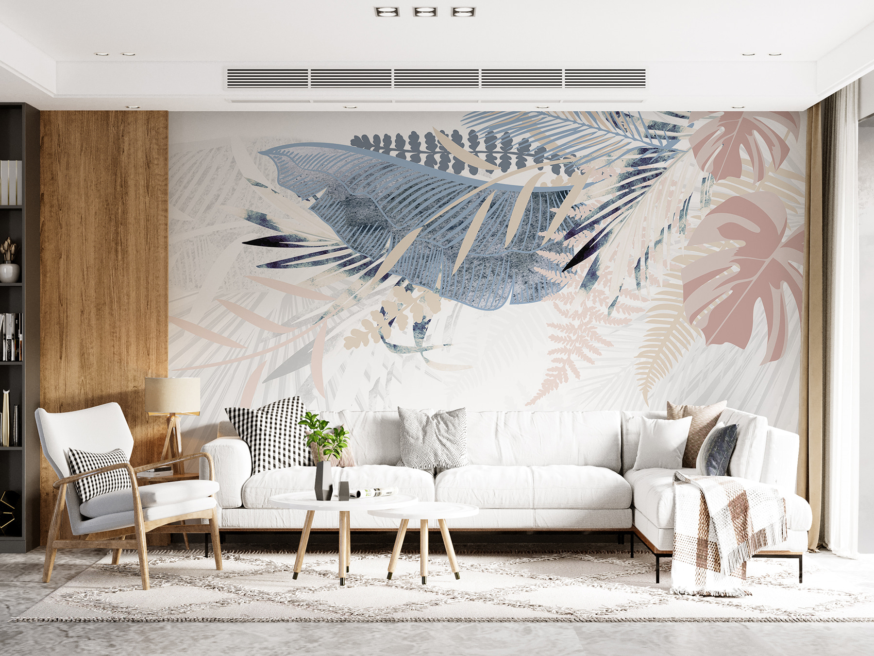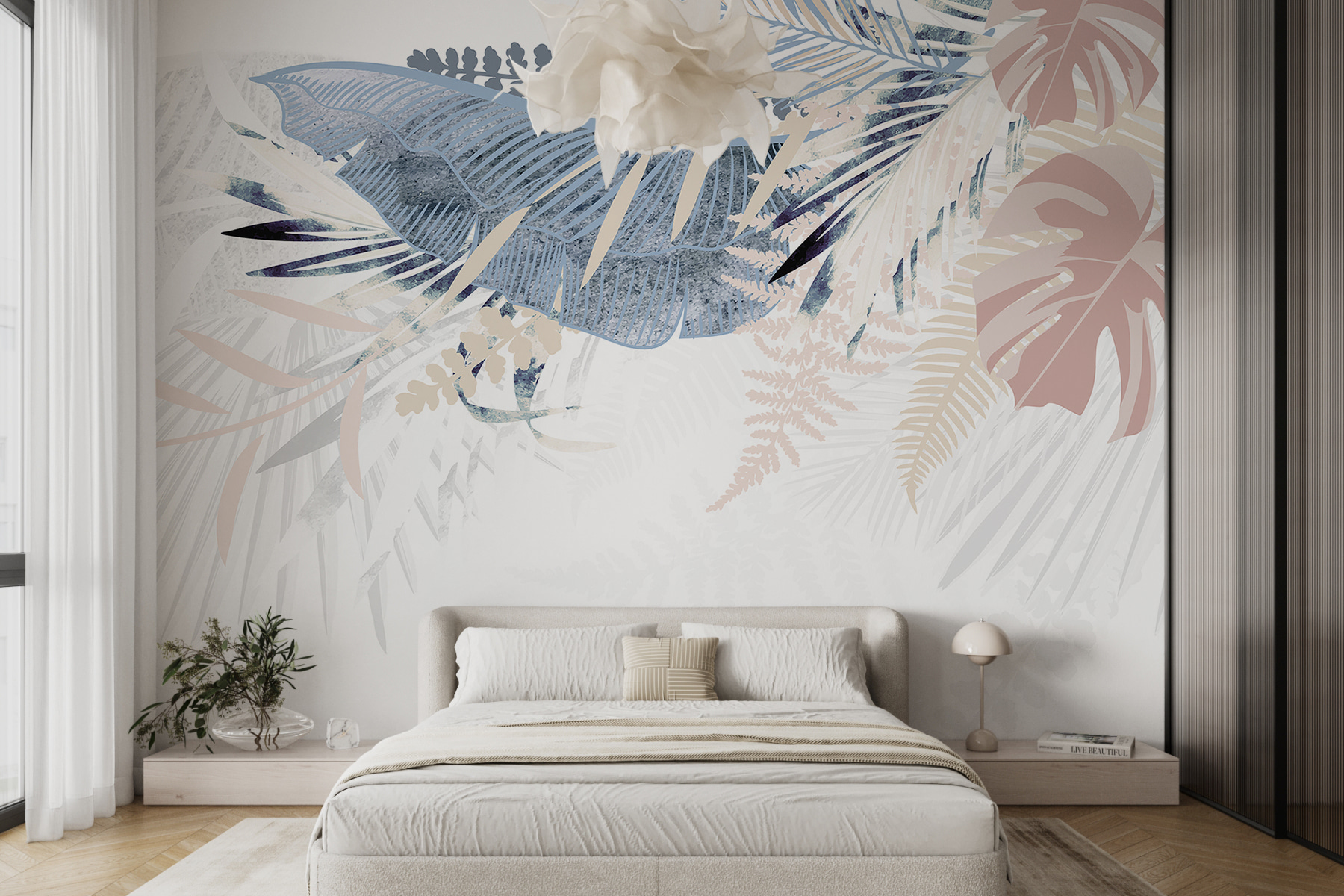 Date un’occhiata a questo splendido “Murales astratto con fogliame tropicale”! È come una boccata d’aria fresca per qualsiasi stanza, che trasforma istantaneamente il vostro spazio in un rifugio artistico e lussureggiante. Le foglie di palma sovrapposte e le delicate piante tropicali, rese in tonalità morbide e fredde, offrono un mix perfetto di tranquillità e raffinatezza. Immaginate di sorseggiare il caffè del mattino o di rilassarvi con un libro, circondati da questa serena atmosfera da giungla.