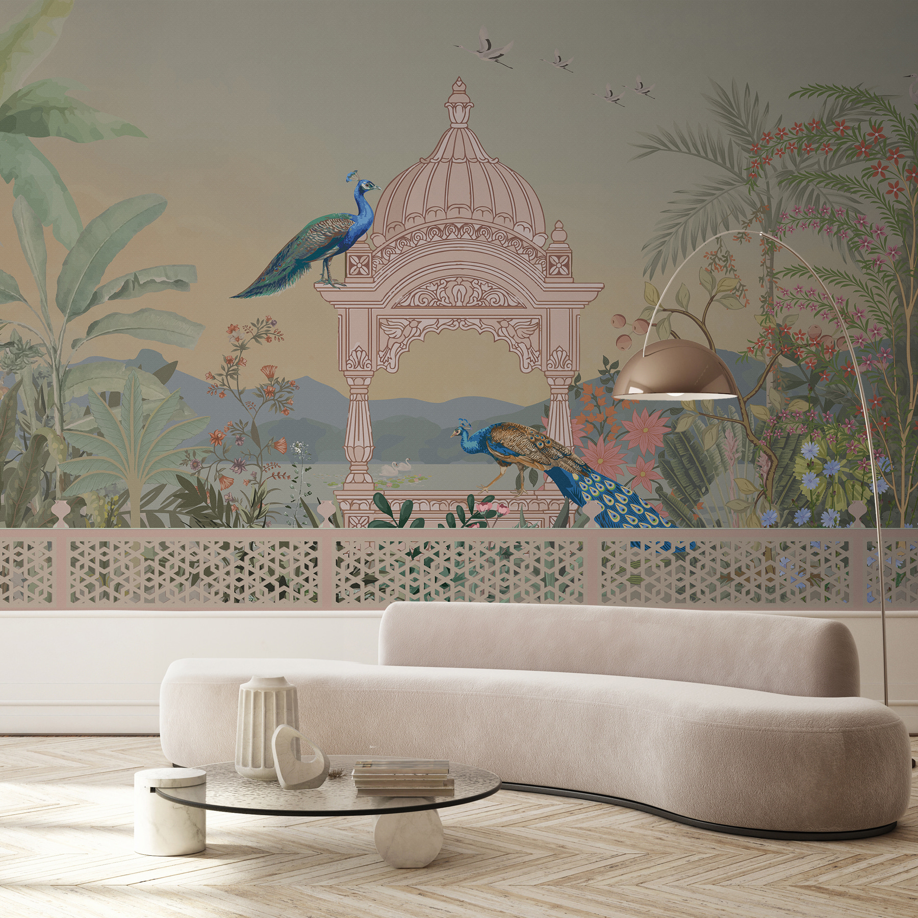 Guardate esattamente come apparirà il vostro spazio con la nuova carta da parati prima di acquistarla. Visualizzazione professionale da parte di designer esperti senza alcun costo o obbligo di acquisto.